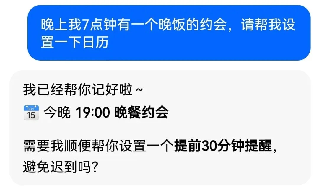 最基本的,你可以跟豆包说”提醒我今天晚上七点有饭局”,它就帮你设好提醒了。