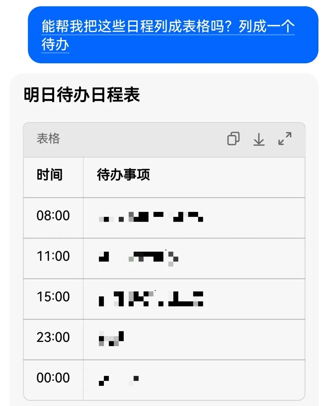 大家也可以随时加新的待办。如果今天的事情比较多,直接说”帮我把今天的待办事项列成表格”,几秒就整理好了。