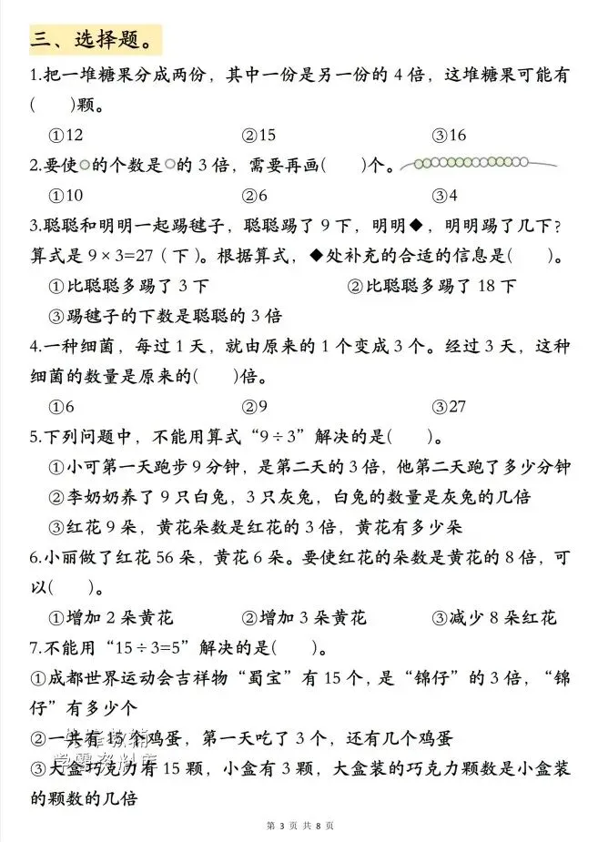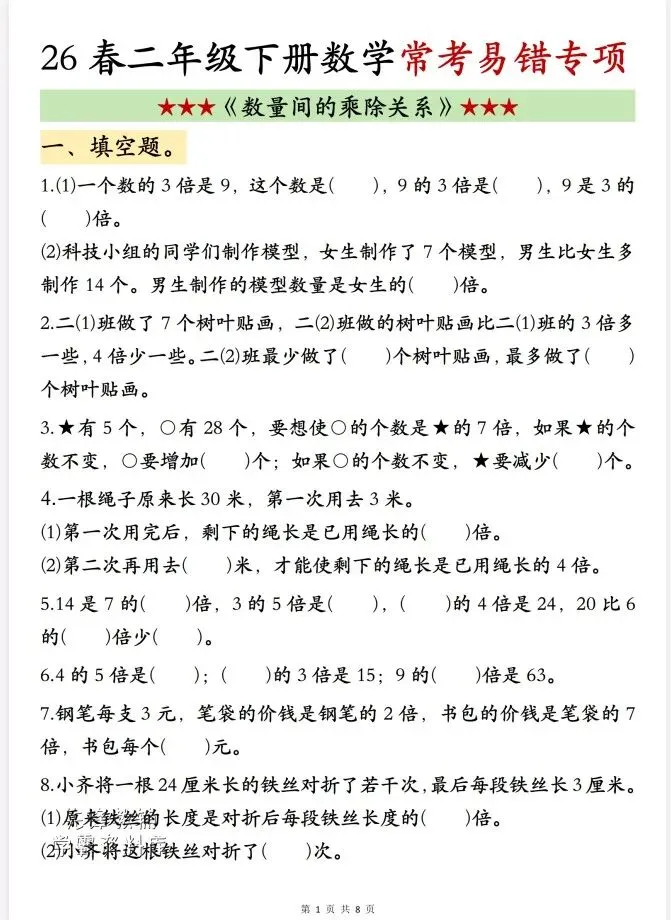 今天给大家整理了26春二年级下册数学《数量间的乘除关系》常考易错专项,转发给朋友或班级群,受益更多人,帮助孩子学习!