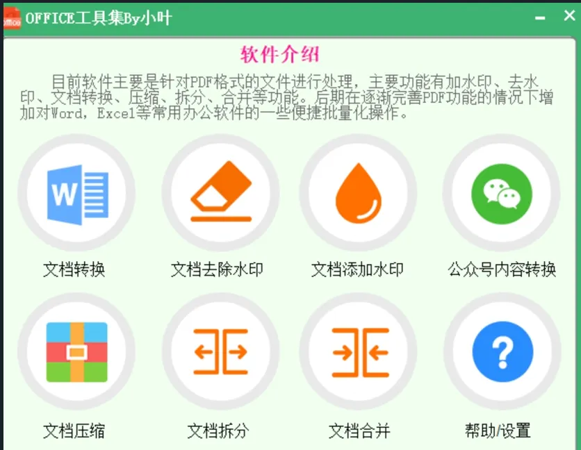 offce工具集是一款集文档转换pdf转word、文档除水印、文档添加水印文档压缩等众多功能为一体的软件,打开即用好用。