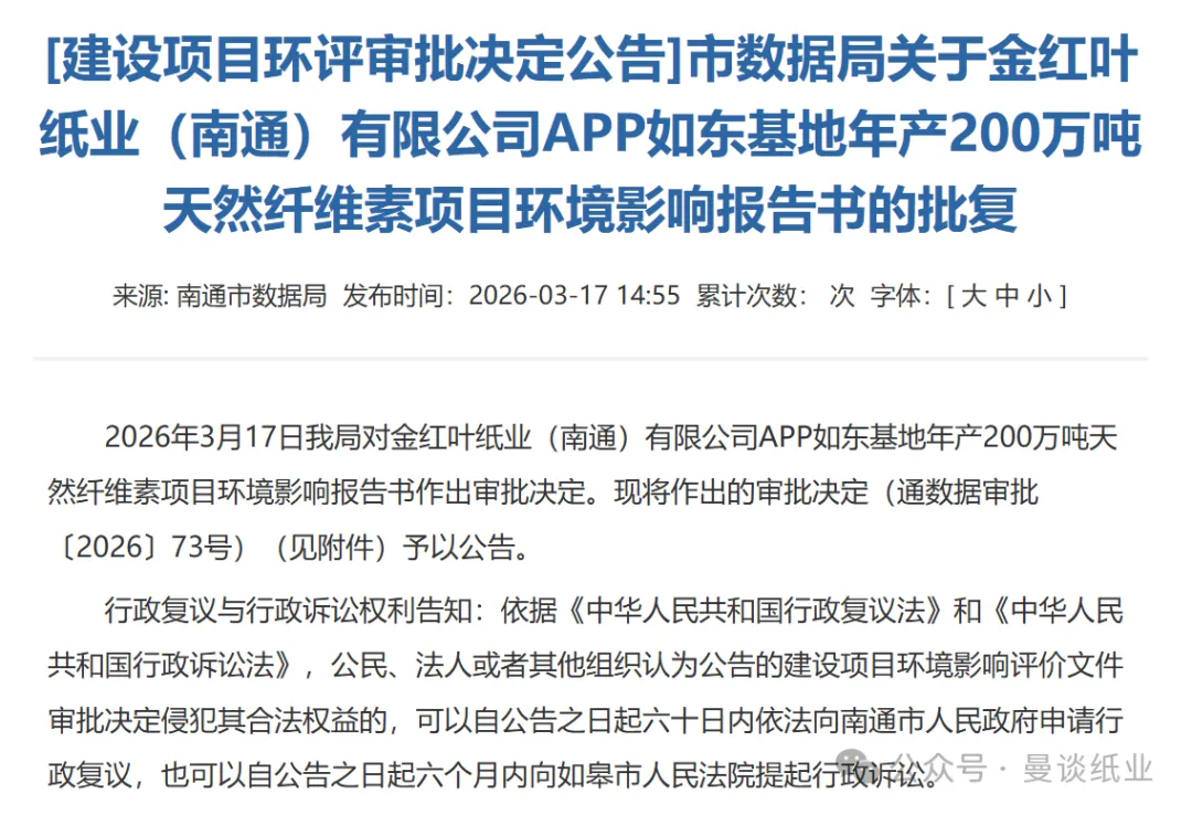 3月17日,南通市数据局发布了项目的批复公告,公告称:“根据项目环评结论,在公司严格落实《报告书》提出的各项生态环境保护措施及环境风险防范措施、各类污染物稳定达标排放且不突破控制总量的前提下,仅从环保角度分析,项目在拟建地址建设可行。”