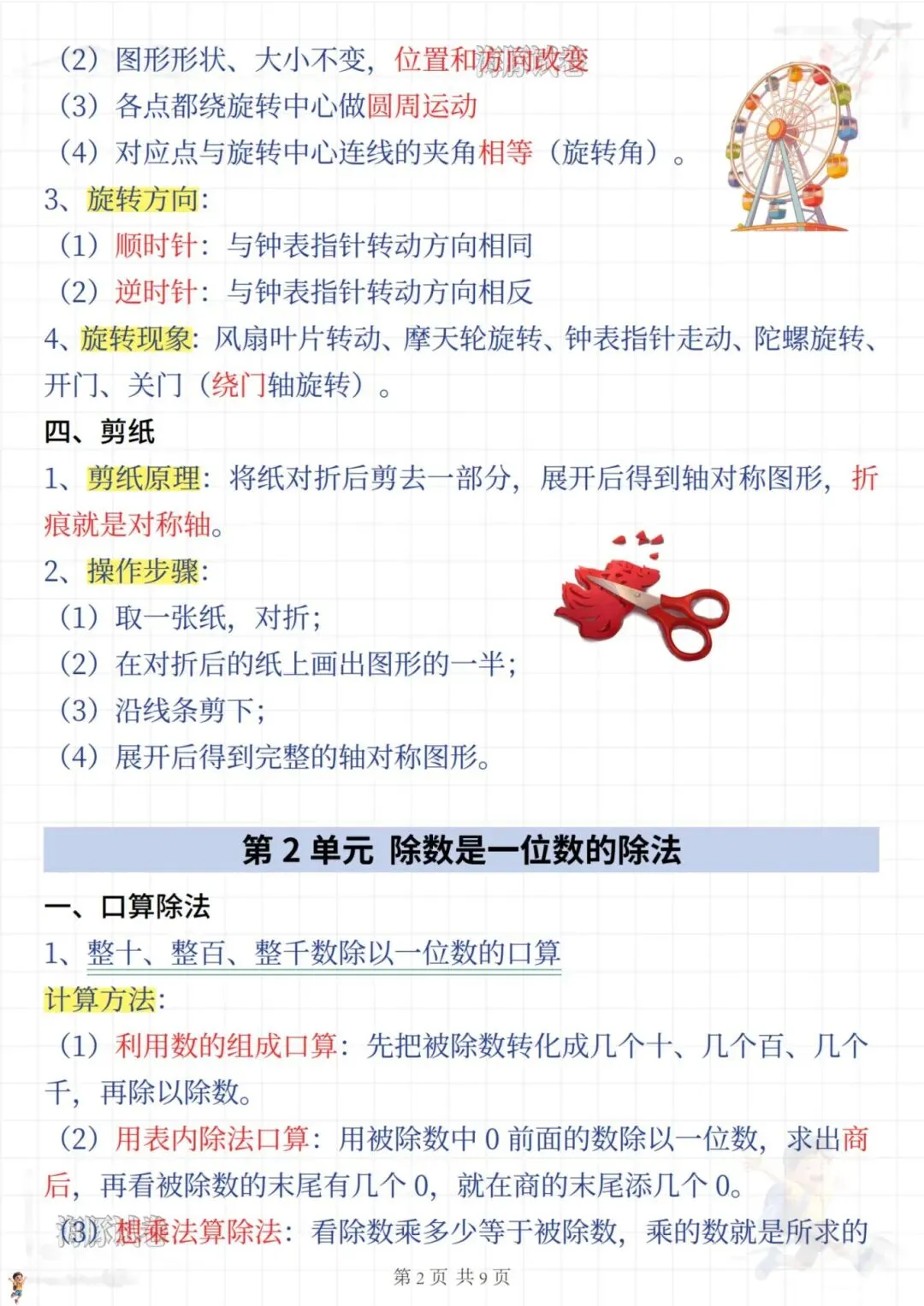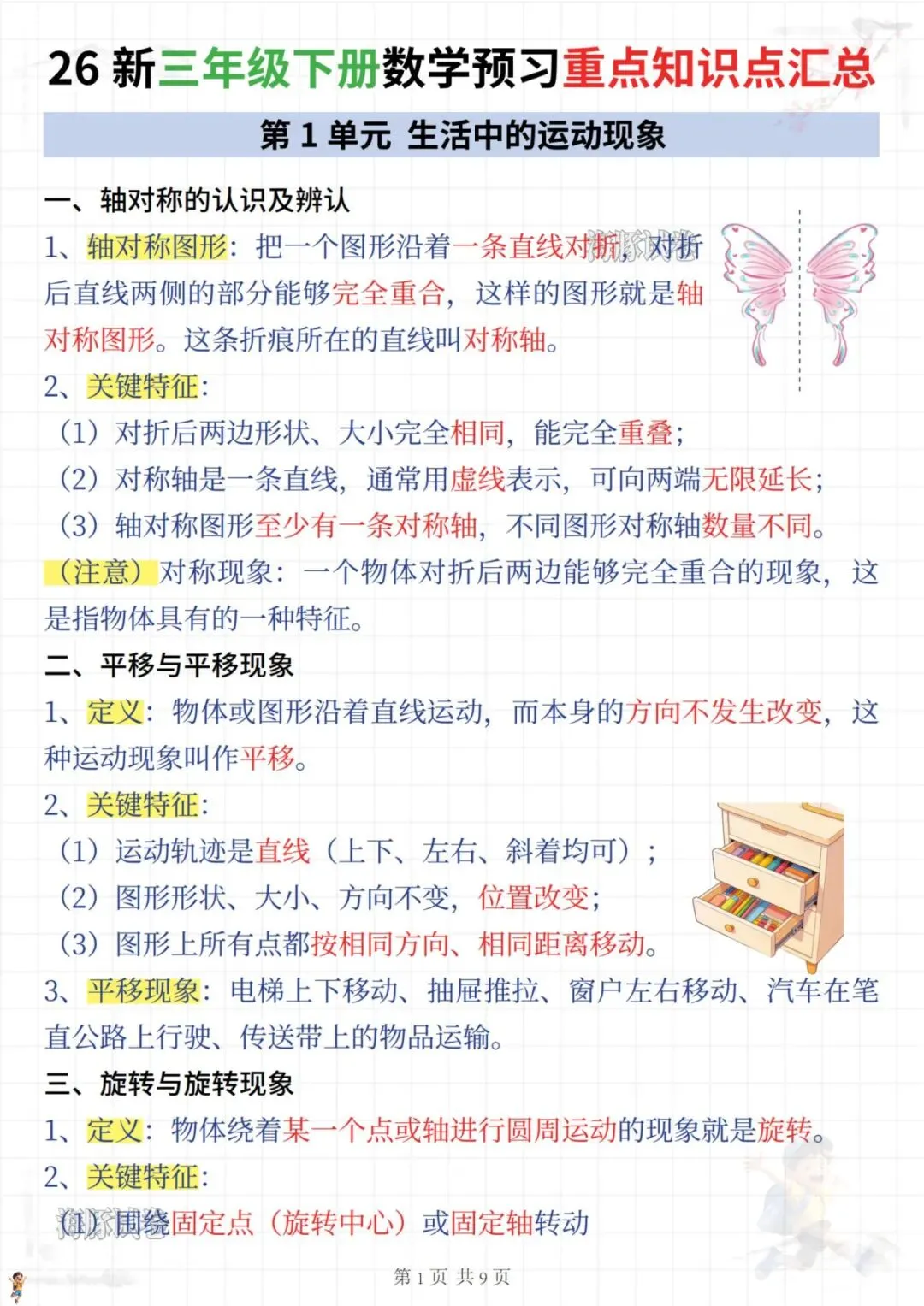 新版三年级下册数学预习重点知识点汇总,电子版可下载可打印!这份资料把三年级下册数学的重点都整理得清清楚楚,从图形的运动到除法计算,从周长面积到时间单位,每个知识点都讲得明明白白,还有例题和方法指导。孩子们每天学一点,数学知识掌握得牢固,解题更轻松!家长们快打印出来,让孩子提前预习,数学学习不吃力!