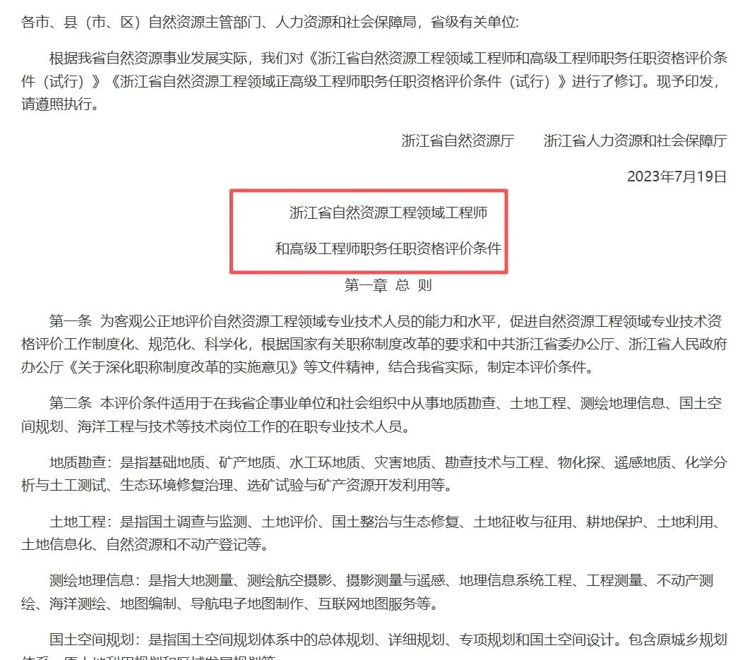【浙江】浙江自然资源工程领域工程师职务评价条件,可参考