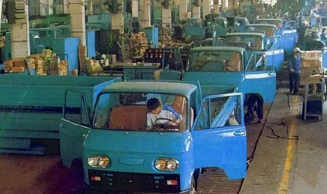 再往后看,味道就变了。像北京130、跃进130这一类平头轻卡,车头一下子“收”起来了,整车显得更紧凑。尤其是厂房里那张图,一排蓝绿色小卡车正在线上装配,驾驶室门敞开着,工人探着身子调试,那种工业现场的密度,现在很少见了。