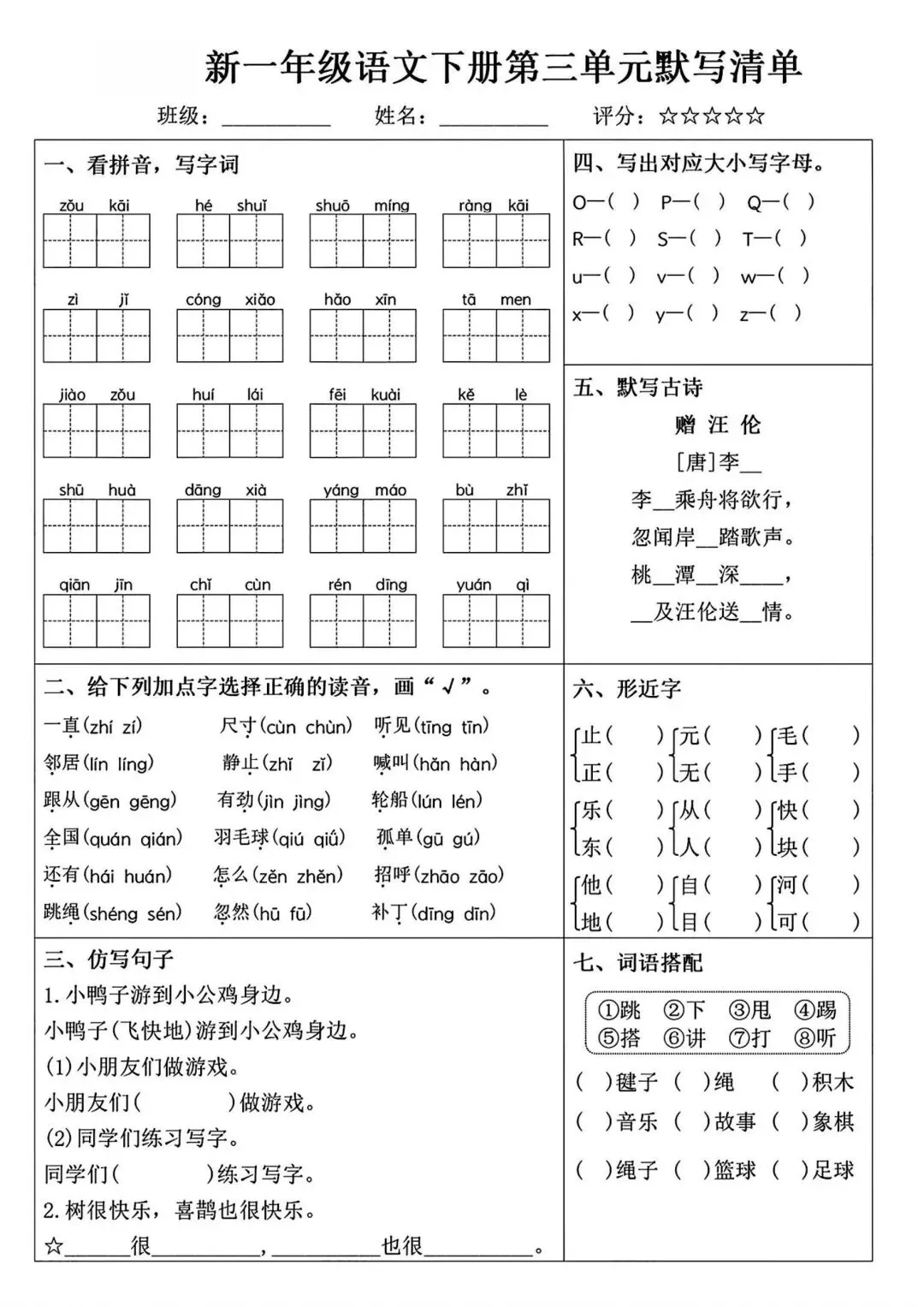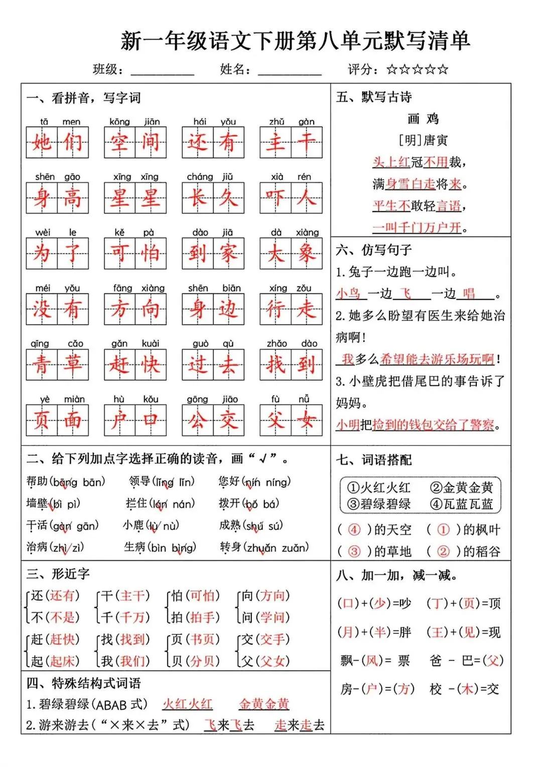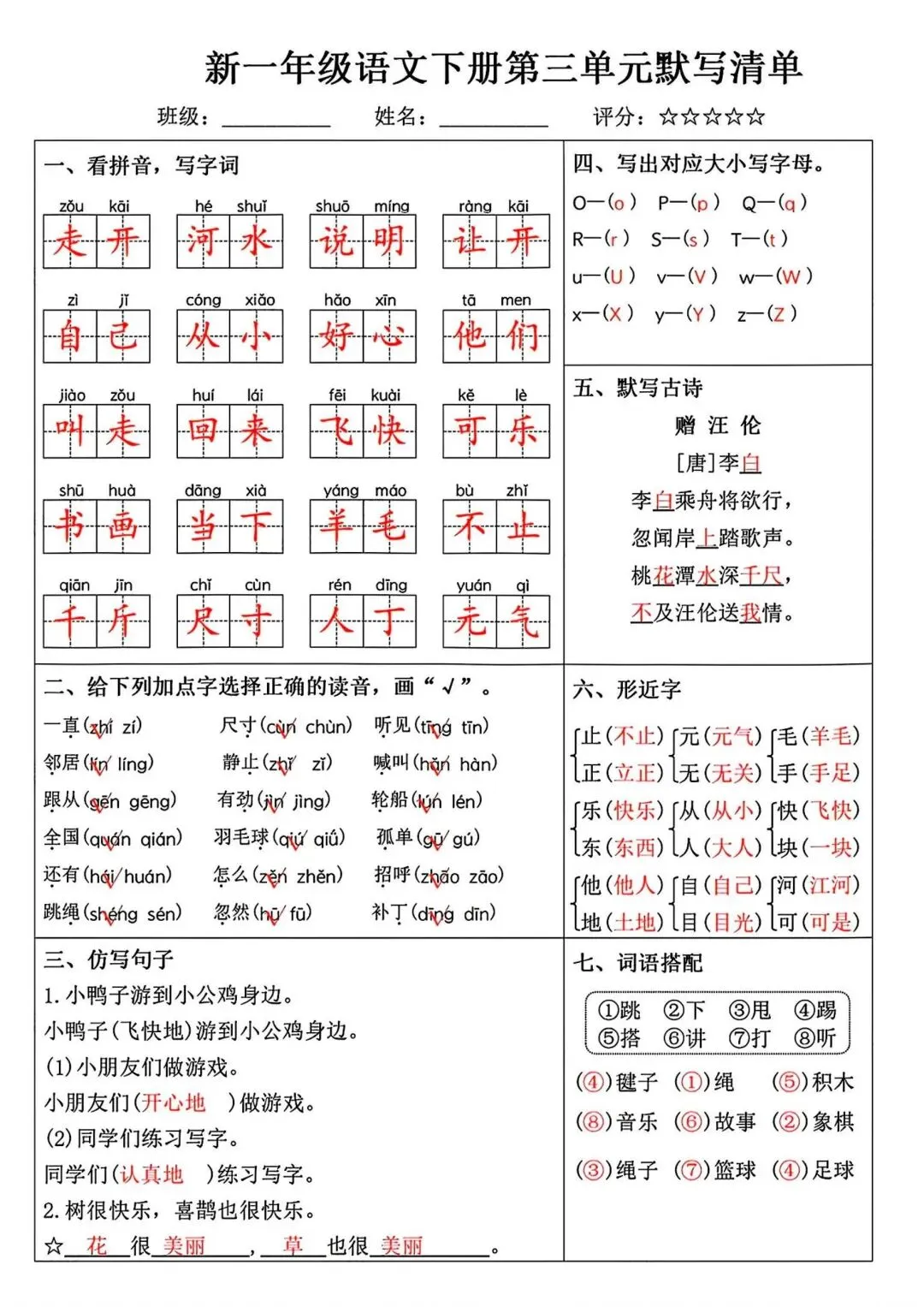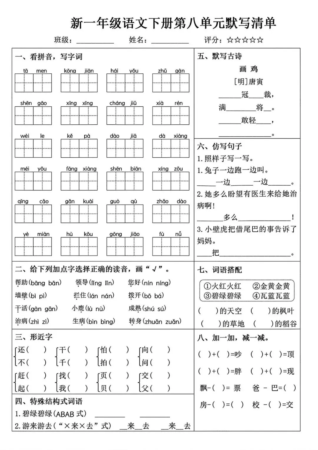 一年级下册语文1-8单元默写清单 PDF电子版,2026春季新版,内容全,带答案,16页,看拼音写词语、古诗默写、课文背诵、形近字、句子仿写、词语搭配、量词、反义词、大小写、字母组合都有,适合学生日常练习和期末复习,家长辅导也很方便~