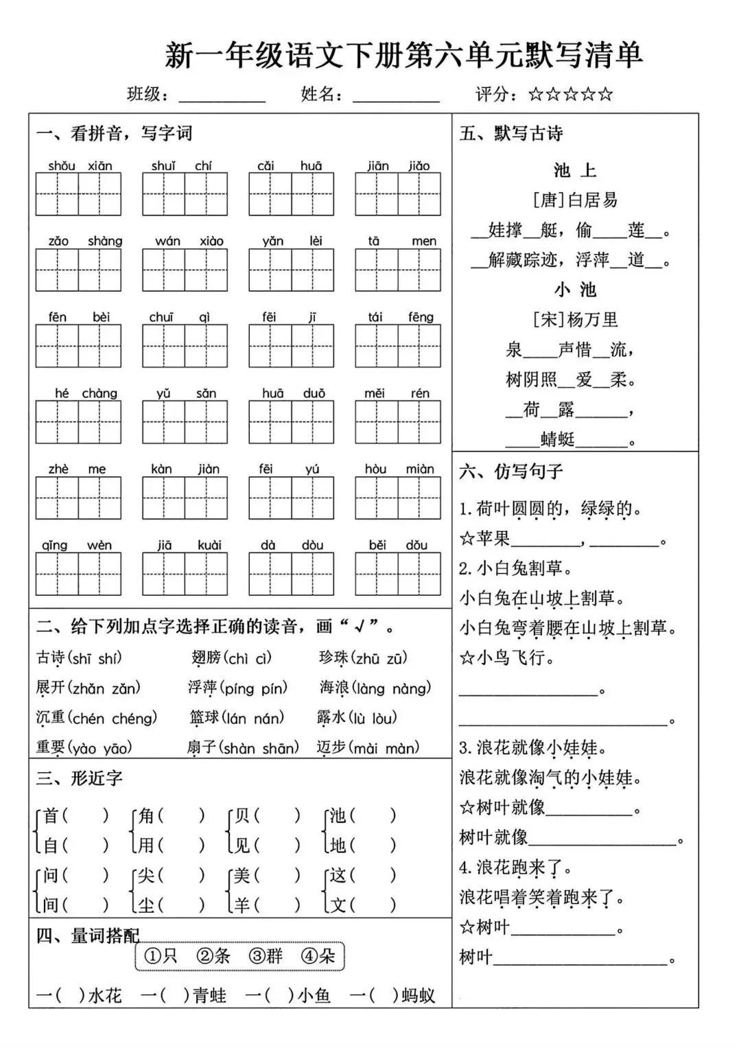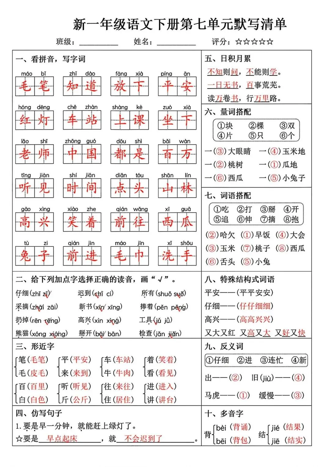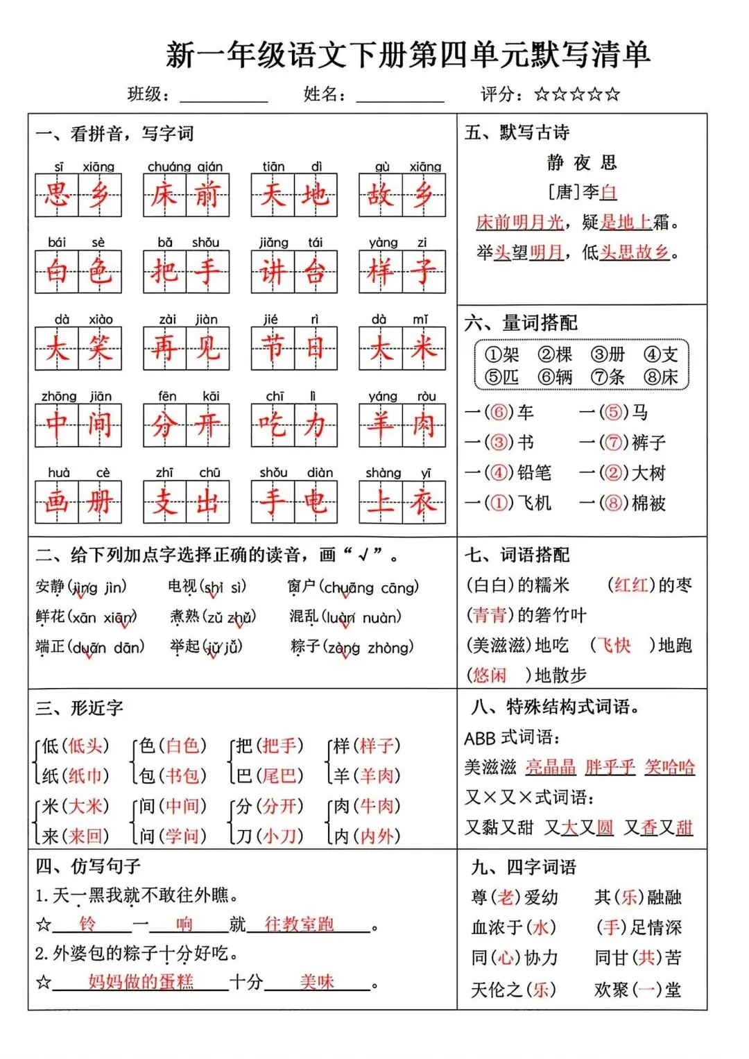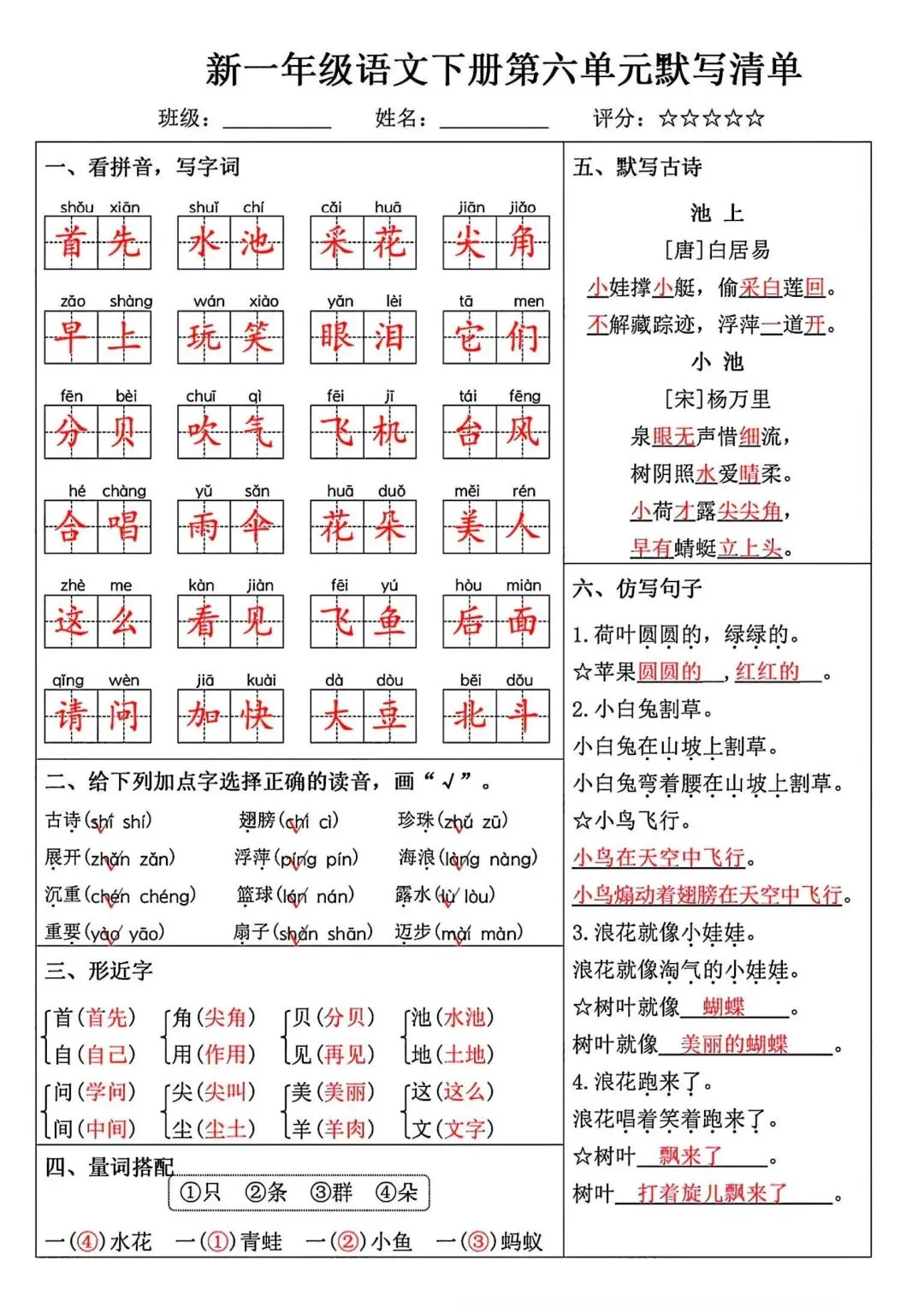 一年级下册语文1-8单元默写清单 PDF电子版,2026春季新版,内容全,带答案,16页,看拼音写词语、古诗默写、课文背诵、形近字、句子仿写、词语搭配、量词、反义词、大小写、字母组合都有,适合学生日常练习和期末复习,家长辅导也很方便~