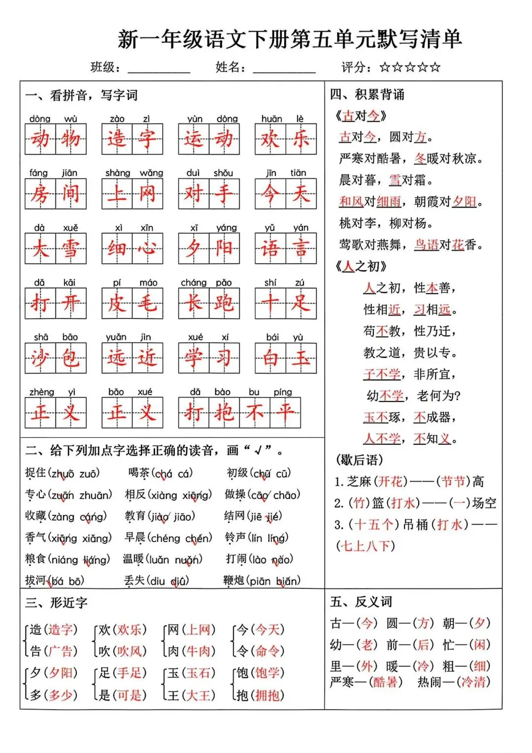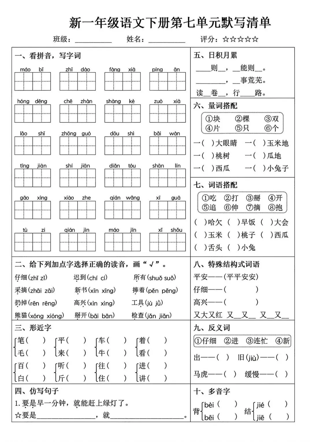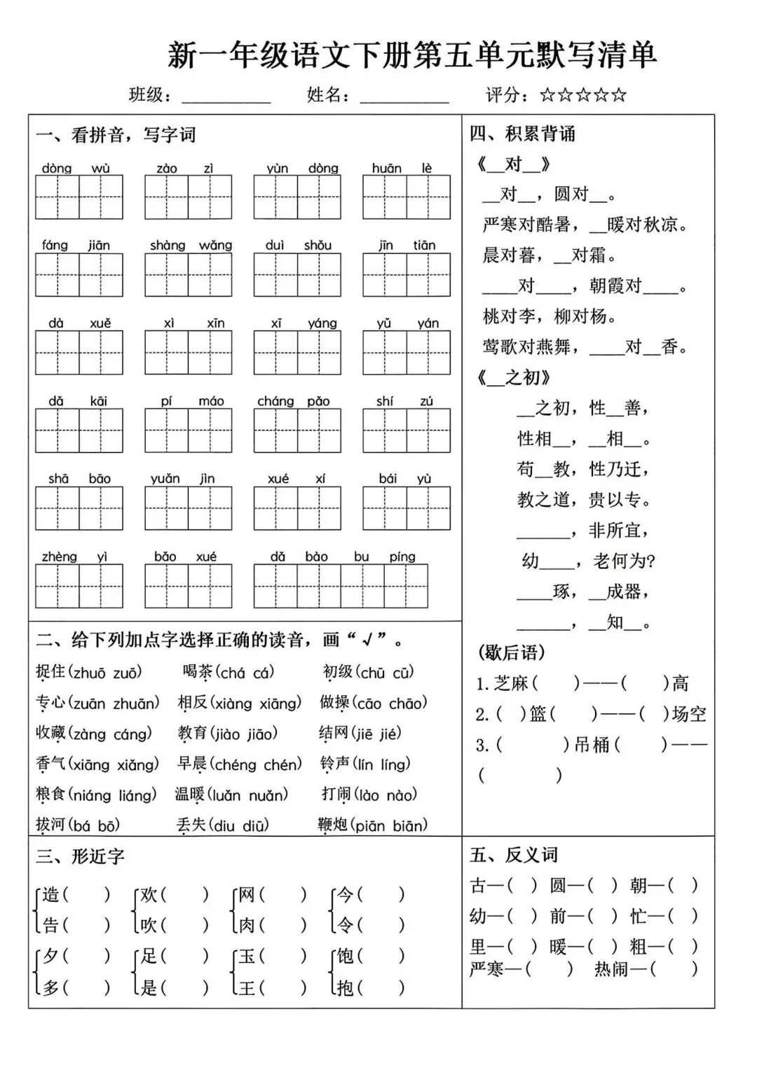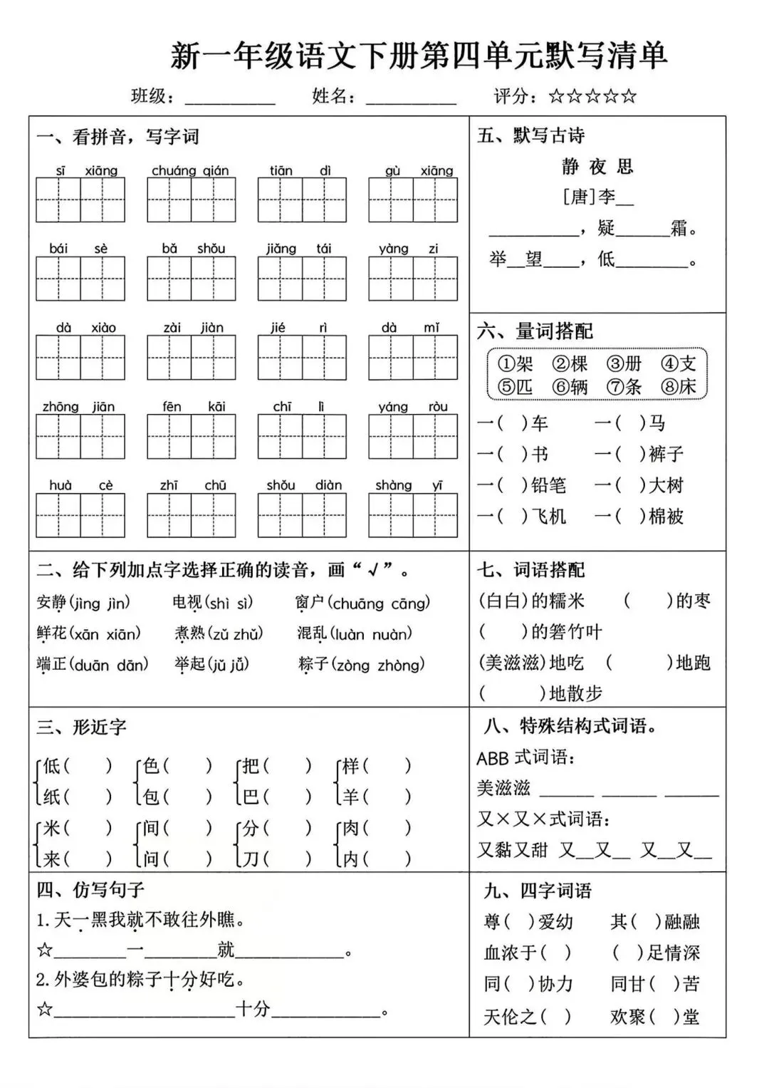 一年级下册语文1-8单元默写清单 PDF电子版,2026春季新版,内容全,带答案,16页,看拼音写词语、古诗默写、课文背诵、形近字、句子仿写、词语搭配、量词、反义词、大小写、字母组合都有,适合学生日常练习和期末复习,家长辅导也很方便~