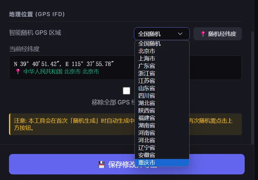 当然也可以修改照片的地理位置,包括全国各地,可随机生成地理位置。