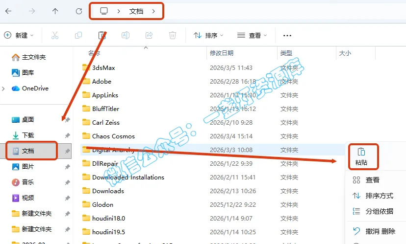 3.双击打开桌面上的【此电脑】,点击左侧【文档】,在打开的【文档】文件夹空白处,鼠标右键【粘贴】刚才复制的文件