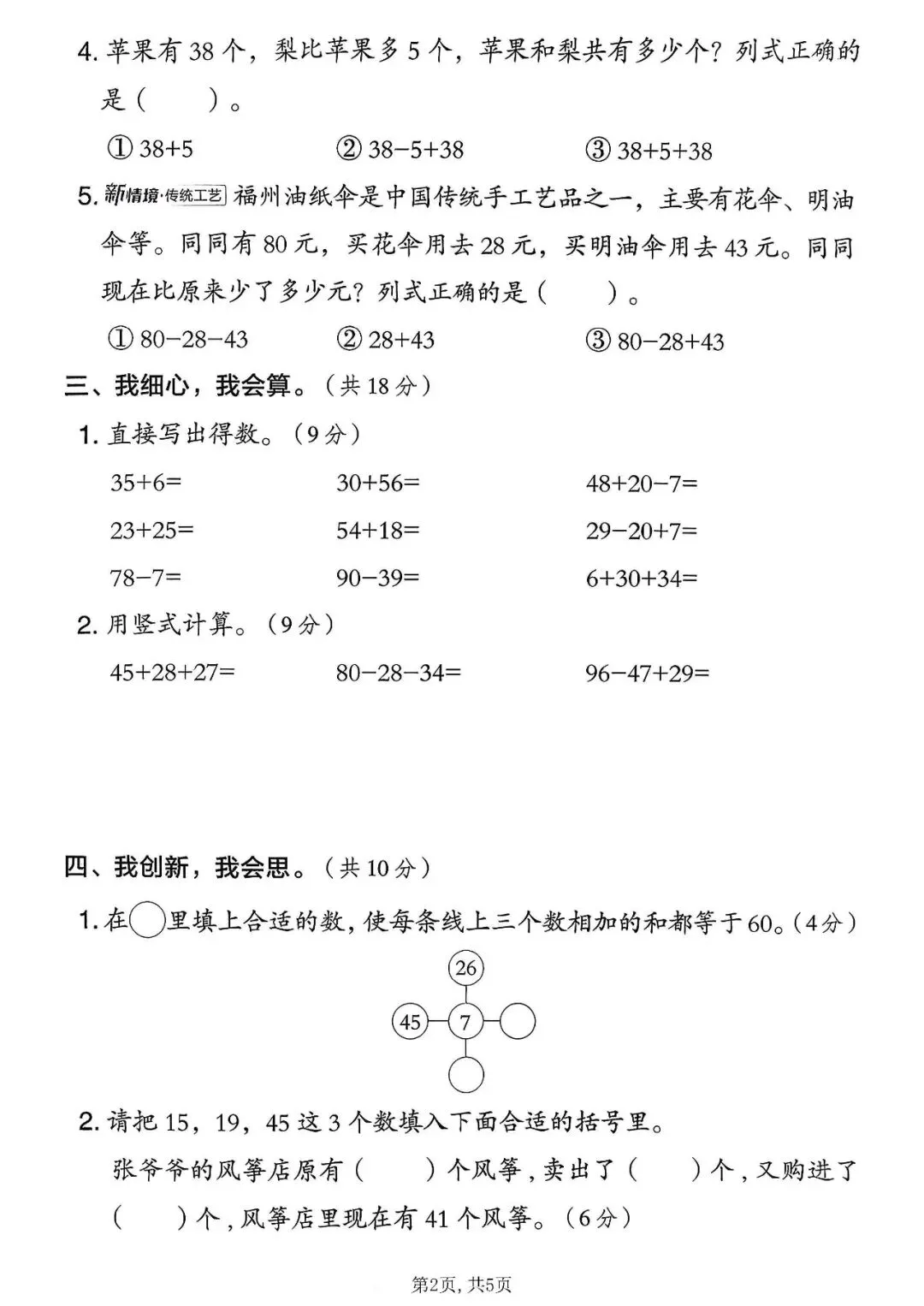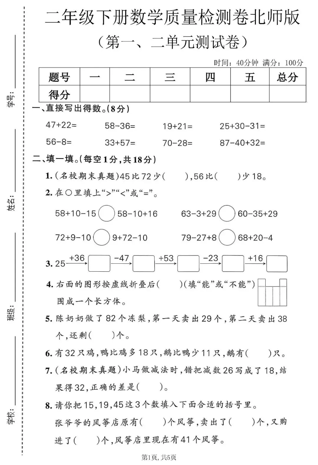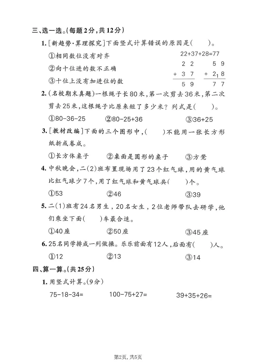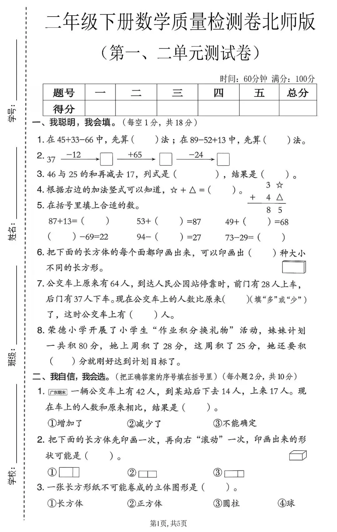 26年北师大版二年级(下册)数学《第一单元测试卷》(共3套)电子版可打印附答案