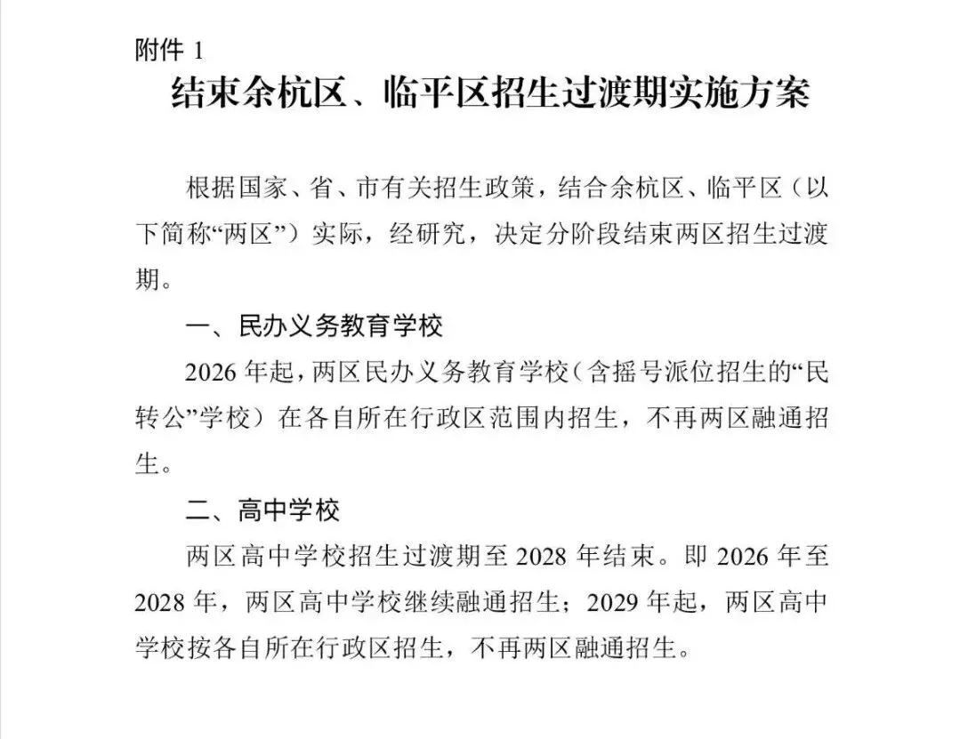 3月15日,一纸《结束余杭区、临平区招生过渡期实施方案》的征求意见公告,在两区家长群中投下了一枚深水炸弹 。