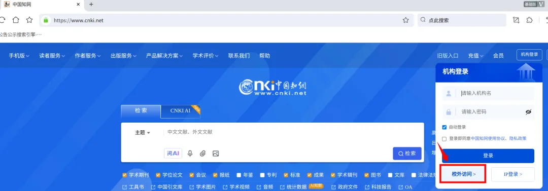 在中国知网总库平台右上角机构登录选择“校外访问”