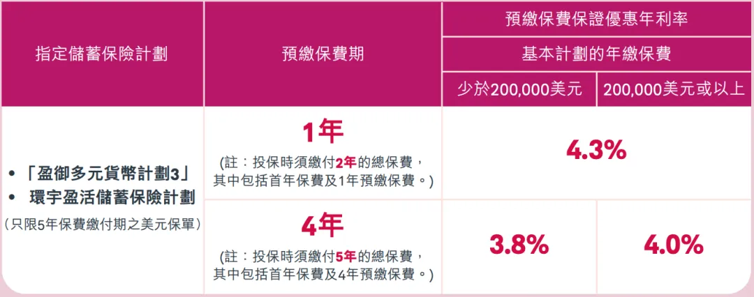 • 5年繳,就一筆過繳付,可享每年4%非保證預繳利率