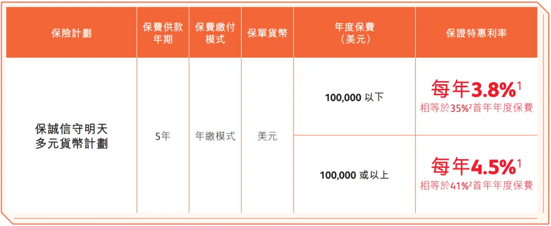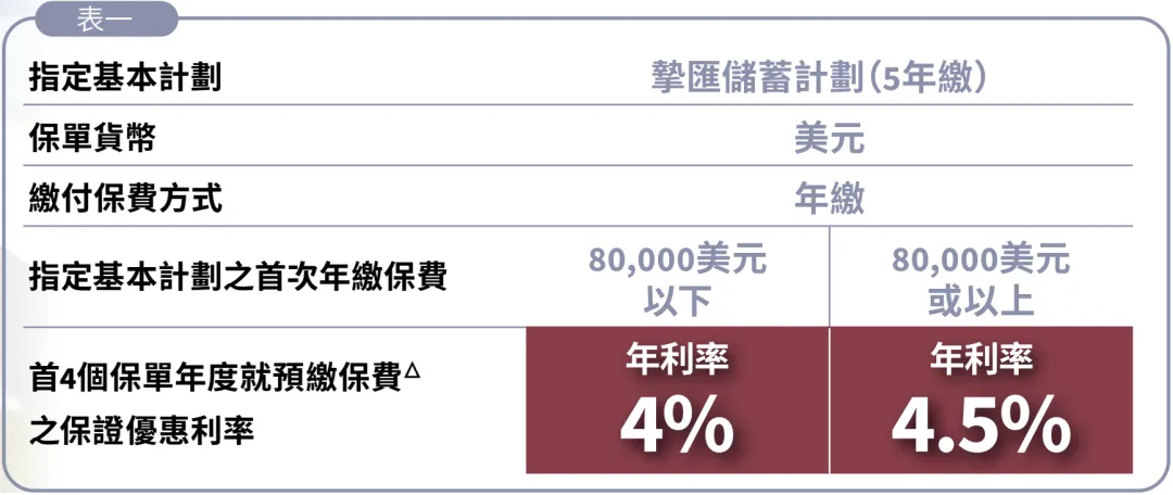 • 預繳5年全期保費的美元保單,可享每年4.5%的保證利率
