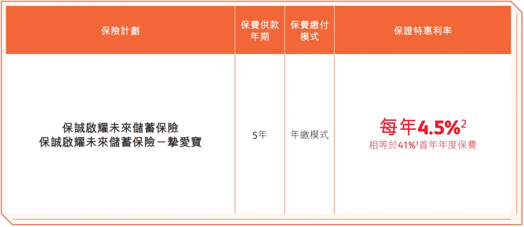 • 5年繳,若一筆過預繳全期保費,預繳保費可享高達每年4.5%保證特惠利率,少付保費相當於41%首年年度保費