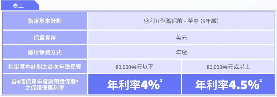 • 預繳2年全期保費的美元保單,可享每年4.5%的保證利率