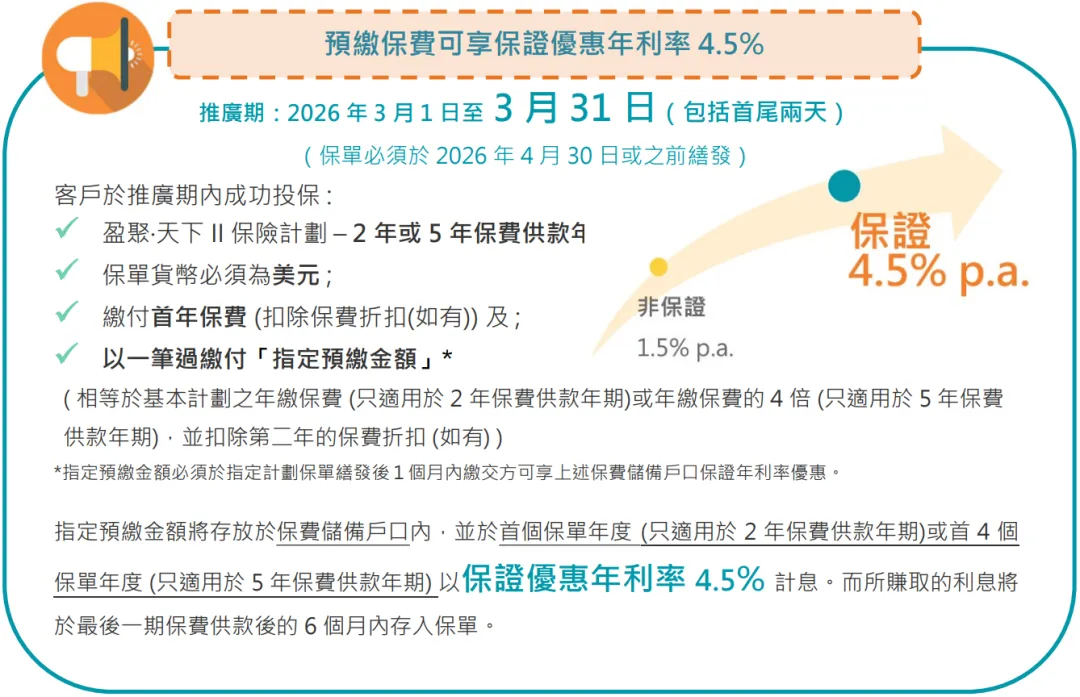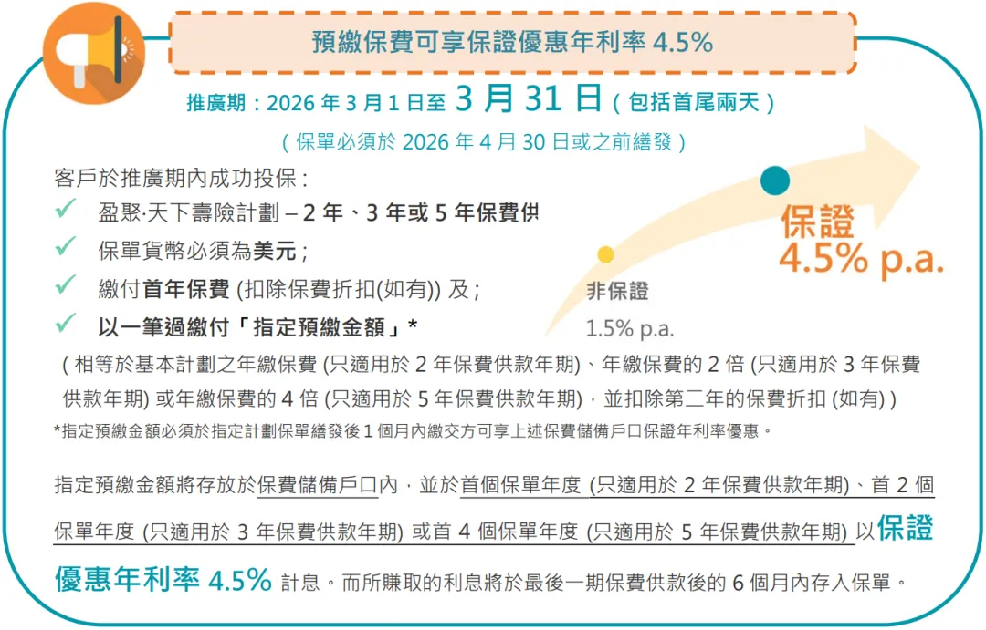 • 預繳保費,可享每年4.5%保證預付保費利率