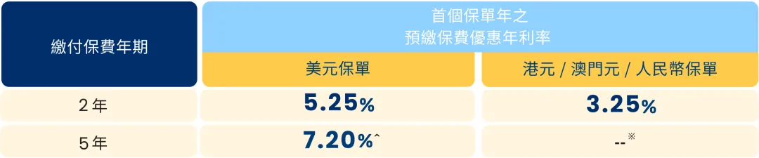 • 一筆過預繳保費,美元保單兼享高達7.20%預繳保費利率