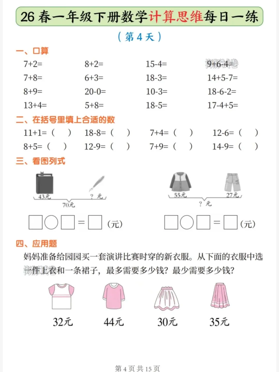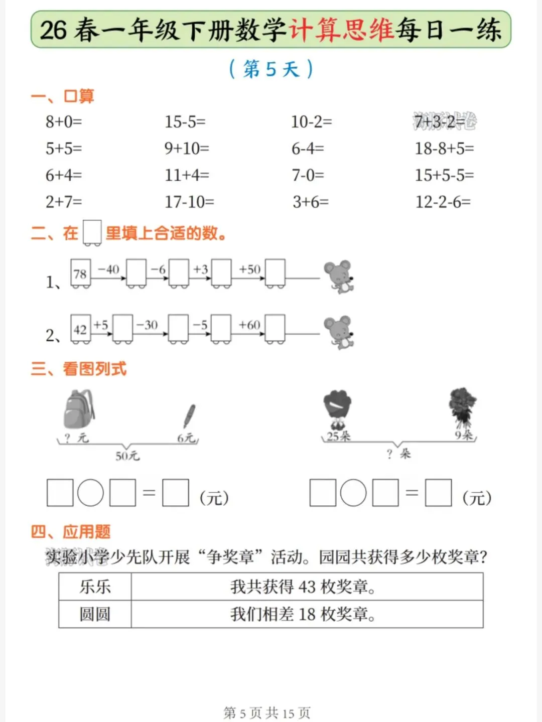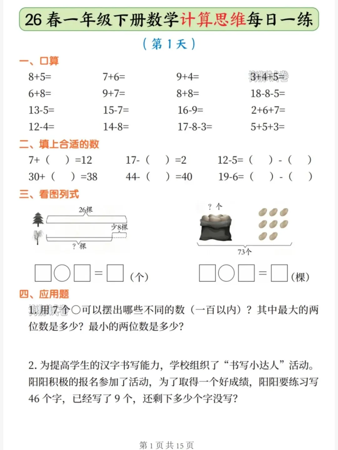 今天给大家分享:26春新一年级下册数学(计算思维每日一练),一共15页。
