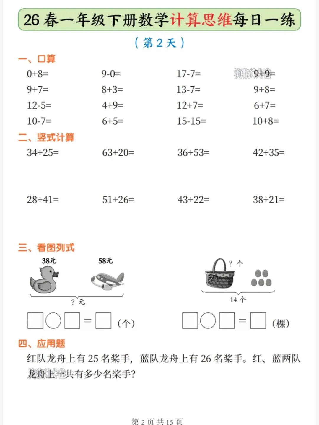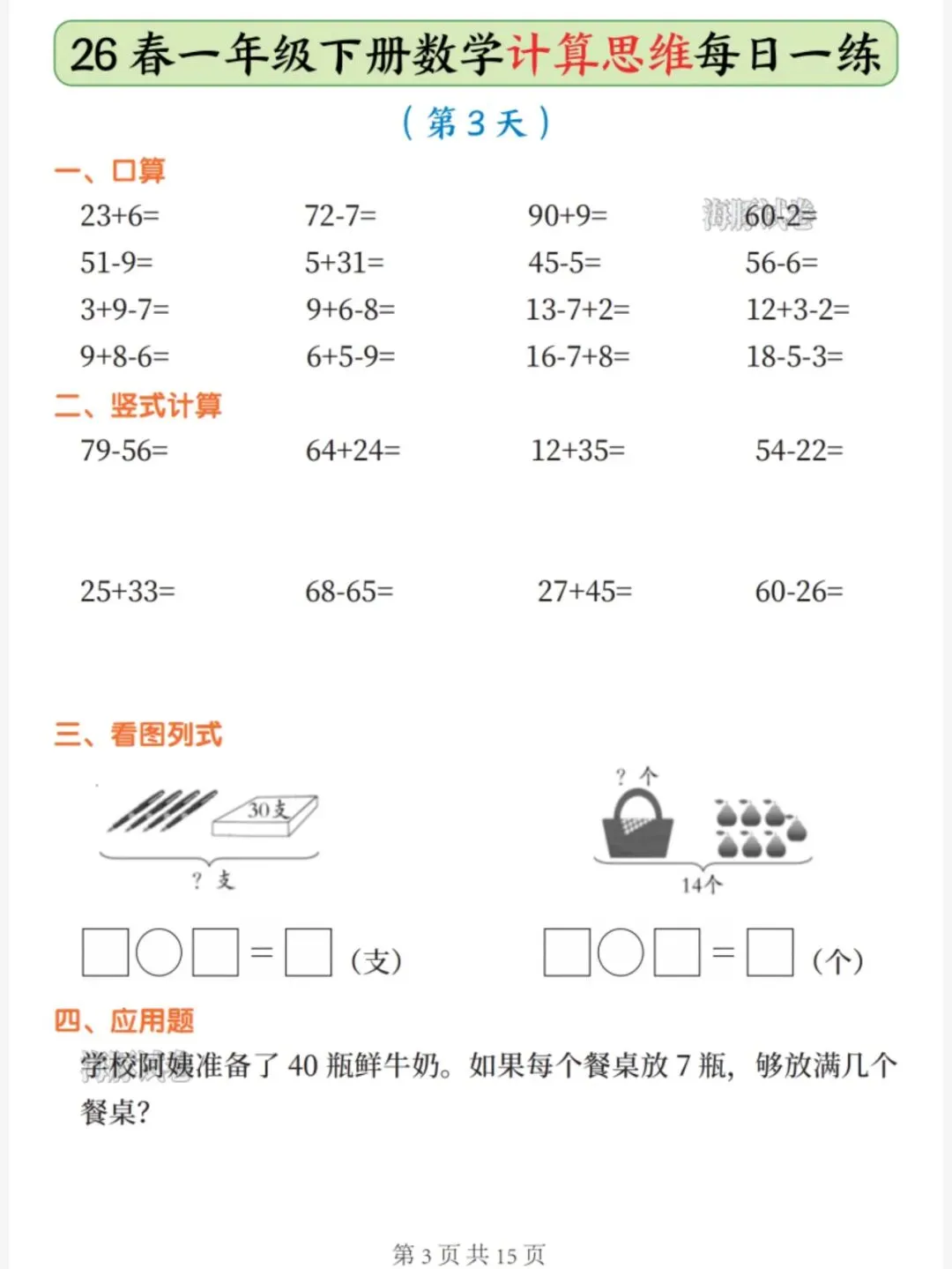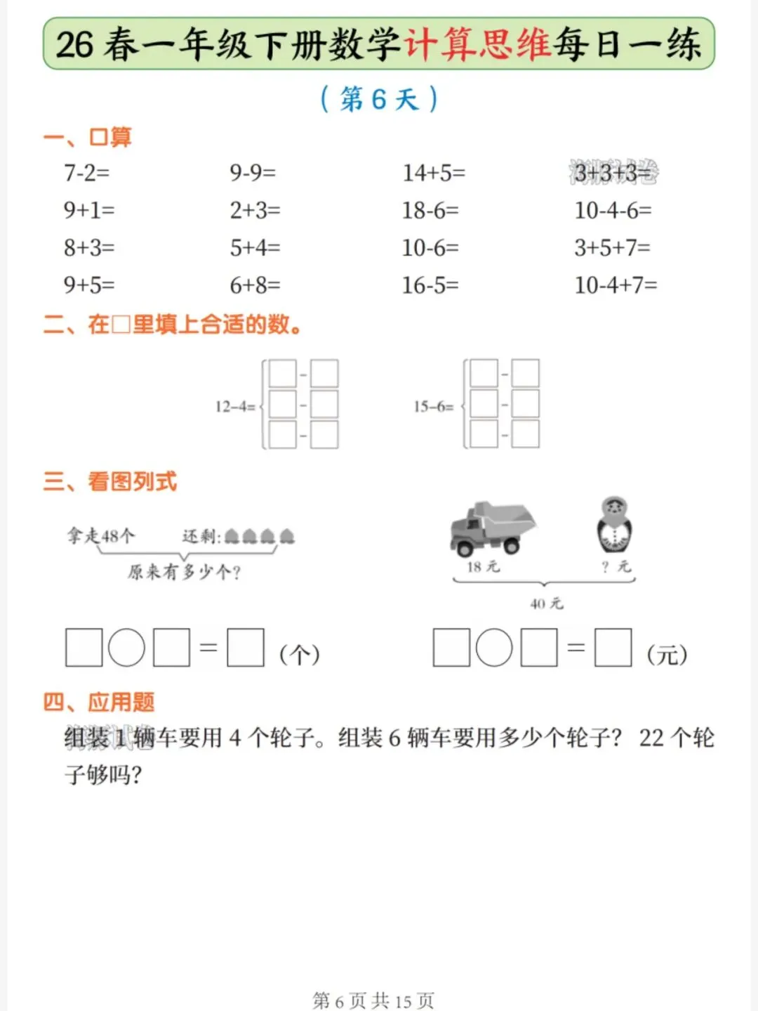 今天给大家分享:26春新一年级下册数学(计算思维每日一练),一共15页。