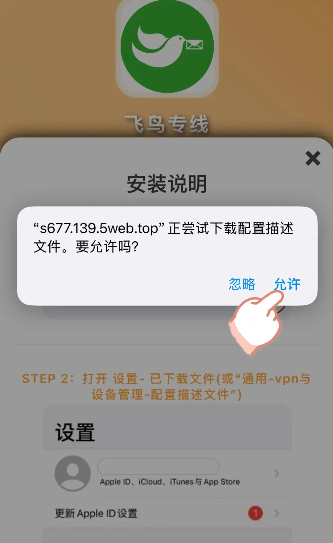 点击 【苹果下载】 按钮,手机会弹出“下载配置描述文件”的提示,请点击 “允许”。