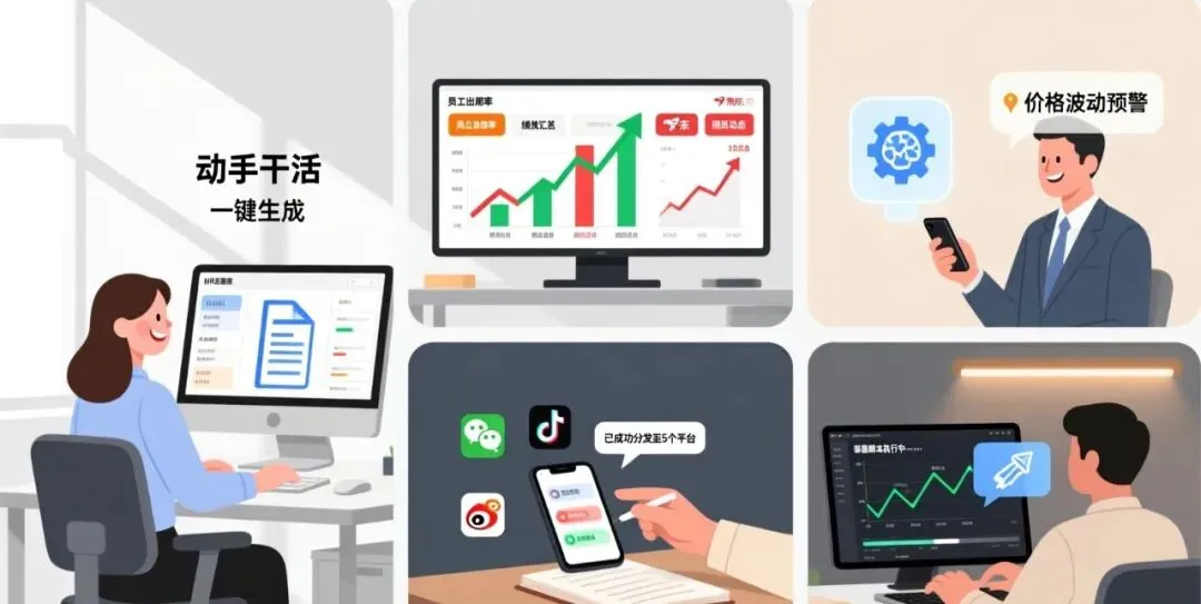 抓取行情、整理调研纪要、生成研报初稿、预警风险指标。投研人员不再被“搬砖”消耗,聚焦策略判断。