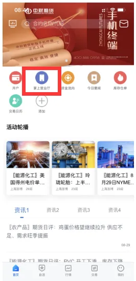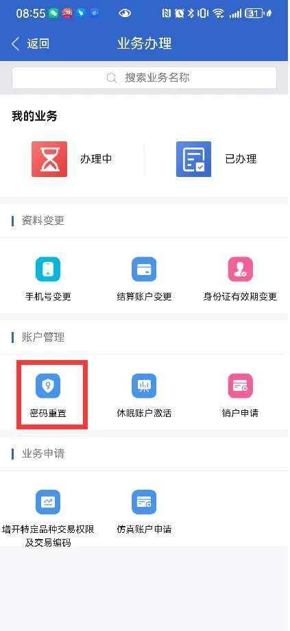 (一)、下载安装“中财期货”APP,进入首页,选择“掌上营业厅”,进入业务办理页面,在账户管理栏,选择“密码重置”;