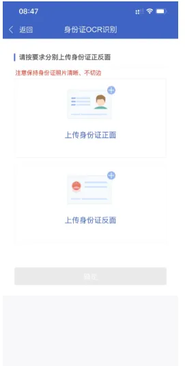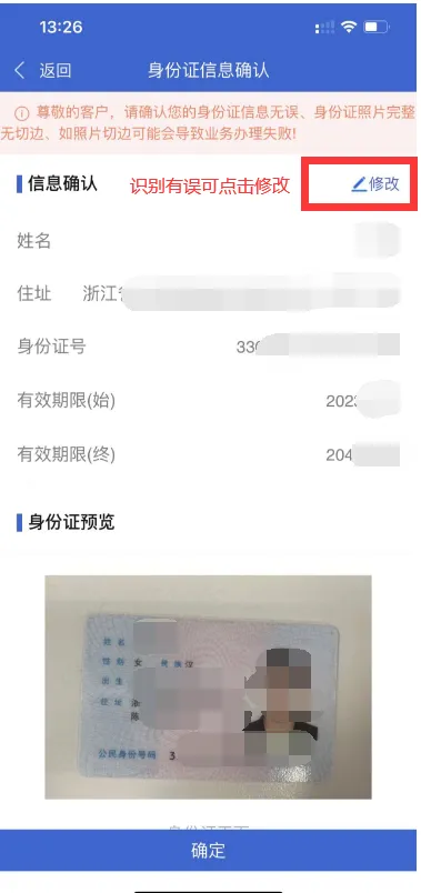 请上传完整清晰、无切边、无水印且无反光的身份证正反面;系统将自动读取您的账户资料,并识别您的身份证有效期等信息,请您确认有效期及证件地址是否识别准确,识别有误可点击修改,若身份证模糊,可点击照片重新拍摄。