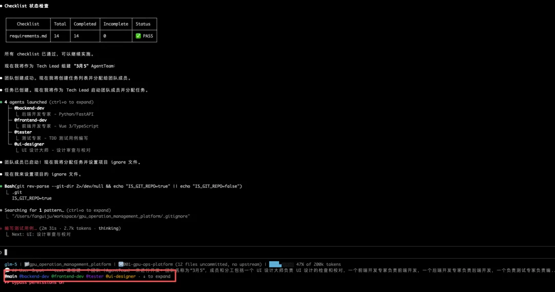 # 步骤一:建立项目宪法# 这会在 .specify/memory/constitution.md 中创建项目的治理原则。/speckit.constitution 建立代码质量、TDD 开发模式、MVP 原型、测试标准和用户体验一致性的原则# 步骤二:创建功能规范(What & Why)/speckit.specify 开发 GPU 运营管理平台,这是一个能够让启动训练和推理任务的用户能够知道自己的 GPU 集群的利用率是好还是坏,以及怎么好怎么坏的平台。你还要参考我头脑风暴的产出材料 docs/mvp-plan.md。# 步骤三:创建技术计划/speckit.plan 详细地参考 @docs/ 目录下的文件,里面有详细的技术方案和计划。# 步骤四:分解任务/speckit.tasks 分解为前端和后端两大块任务组,每个任务组下面再细分各自的任务。因为这样的话后面我的 AgentTeam 就可以各自工作和配合了。# 步骤五:执行实现/speckit.implement 请组建一个团队(AgentTeam) 来进行开发:成员和分工包括一个 UI 设计大师负责 UI 设计的检查和校对,一个前端开发专家负责前端开发,一个后端开发专家负责后端开发,一个负责测试专家负责编写测试用例保障产品质量。请作为你作为 Tech Lead 分配和协调工作,采用 TDD 开发模式。使用 Superpower 提供的 skills 来支持开发工作。# 结果.specify/├── memory/│ └── constitution.md├── specs/│ └── 001-create-taskify/│ ├── spec.md # 功能规范│ ├── plan.md # 技术计划│ ├── tasks.md # 任务清单│ ├── research.md # 技术研究│ ├── data-model.md # 数据模型│ ├── quickstart.md # 快速开始指南│ └── contracts/│ ├── api-spec.json # API 契约│ └── signalr-spec.md # SignalR 规范└── templates/├── plan-template.md├── spec-template.md└── tasks-template.m