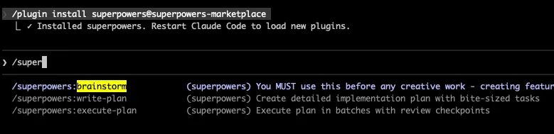 # Project 级别的安装,而非全局# 1. 注册 Superpowers 市场/plugin marketplace add obra/superpowers-marketplace# 2. 安装 Superpowers 插件/plugin install superpowers@superpowers-marketplace# 重新进入 Claude Code# 验证安装/help # 看到 brainstorm、write-plan、execute-plan 这 3 个命令就说明安装成功。# 更新 Superpowerscd ~/.claude/superpowersgit pull