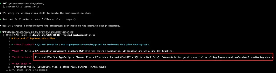 writing-plans:用于编写实施计划。它会根据头脑风暴阶段的成果将计划写成一个个文件,例如:docs/plans/2026-03-05-frontend-ui-design.md。 -