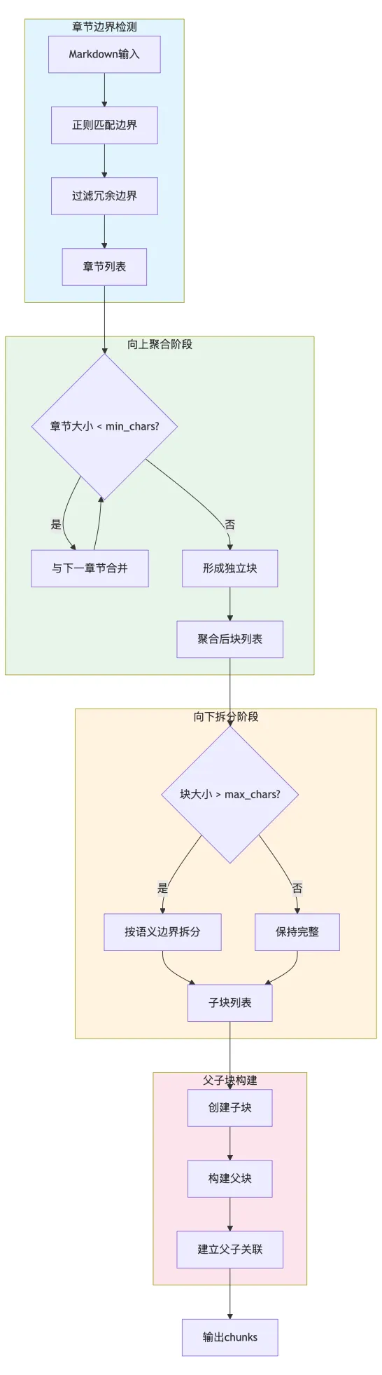 章节边界检测只是分块的第一步。真实世界的文档结构千差万别:有的文档章节划分过细,每个章节只有寥寥数语(如只有标题没有内容的空章节);有的文档则存在超长章节,包含数万字的连续内容(如详细设计说明)。为了应对这些复杂情况,系统设计了双向分块策略。