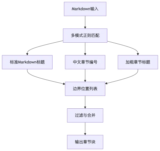 这些模式按照优先级组合成一个联合正则表达式,通过一次扫描即可识别出文档中所有的潜在章节边界。随后,系统会对检测到的边界进行过滤,剔除那些间距过近的冗余边界,确保最终保留的章节边界具有足够的语义区分度。