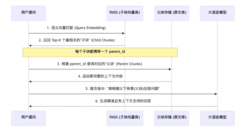 子块(Child Chunk):短小精悍(约300-500 tokens),专用于向量匹配。这确保了检索的“准”。子块被存储在FAISS向量数据库中,支持基于语义相似度的快速检索。