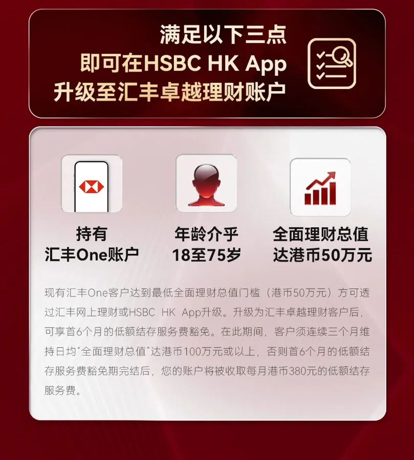 今天,香港银行圈迎来了一个极其魔幻的时刻:汇丰银行官方正式摊牌了! 不仅明确了卓越理财的体验标准,更直接在汇丰 HK App 里,开放了“3 分钟自助升级”功能。不用再给客服打电话,只要系统判定达标,点击同意,尊贵的卓越理财 标志瞬间点亮!