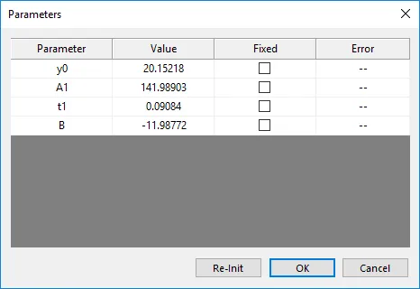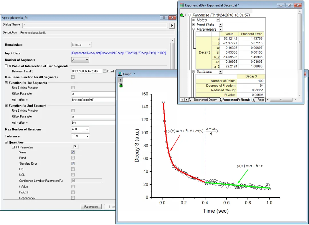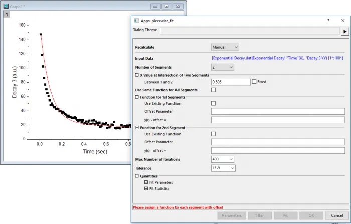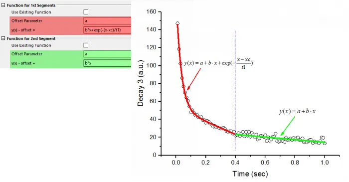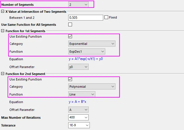 将“分段数”设置为 2;为第 1 段和第 2 段均选择“使用现有函数”。然后,分别选择函数“ExpDec1”和“直线”作为第 1 段和第 2 段的拟合函数。