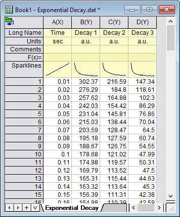 新建一个工作表,选择“数据”>“连接到文件:文本/CSV”菜单,导入示例文件“<Origin程序文件夹>Piecewise Fit\Exponential Decay.dat”。