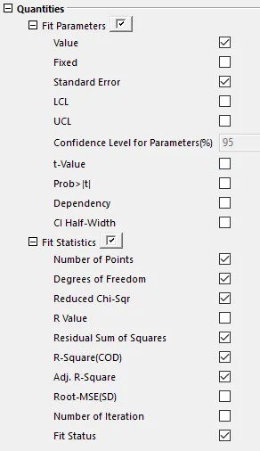 若需自定义输出结果,可展开“拟合参数”和“拟合统计量”分支,勾选需要输出的量,