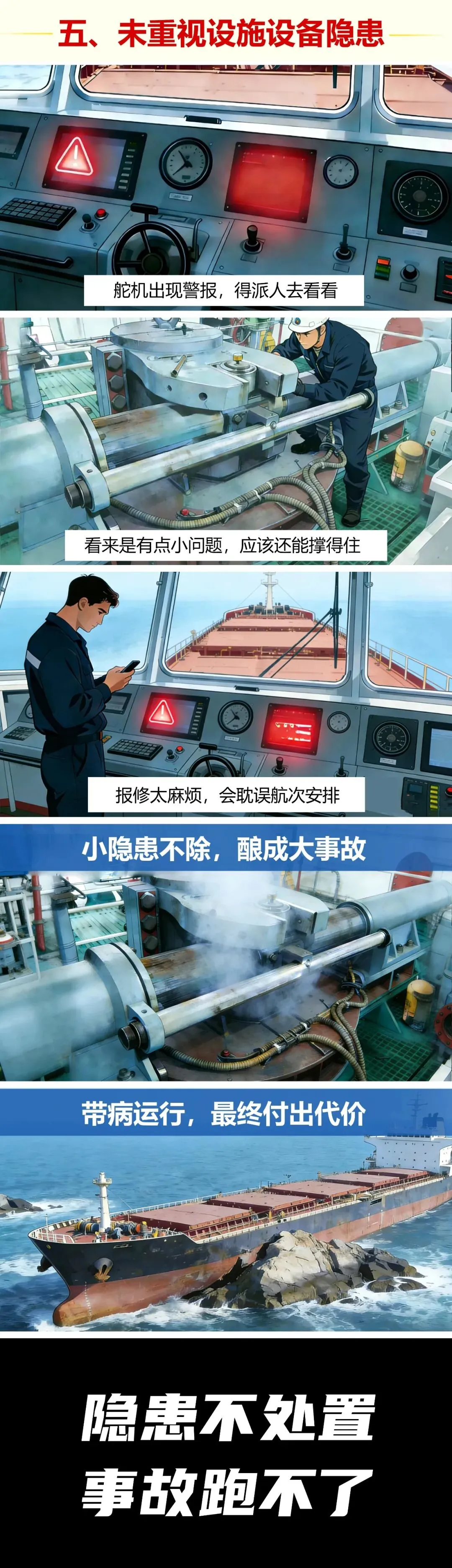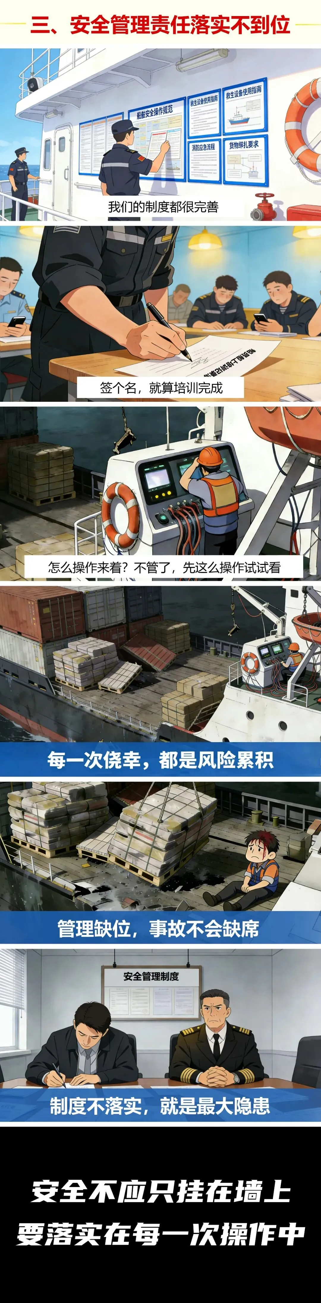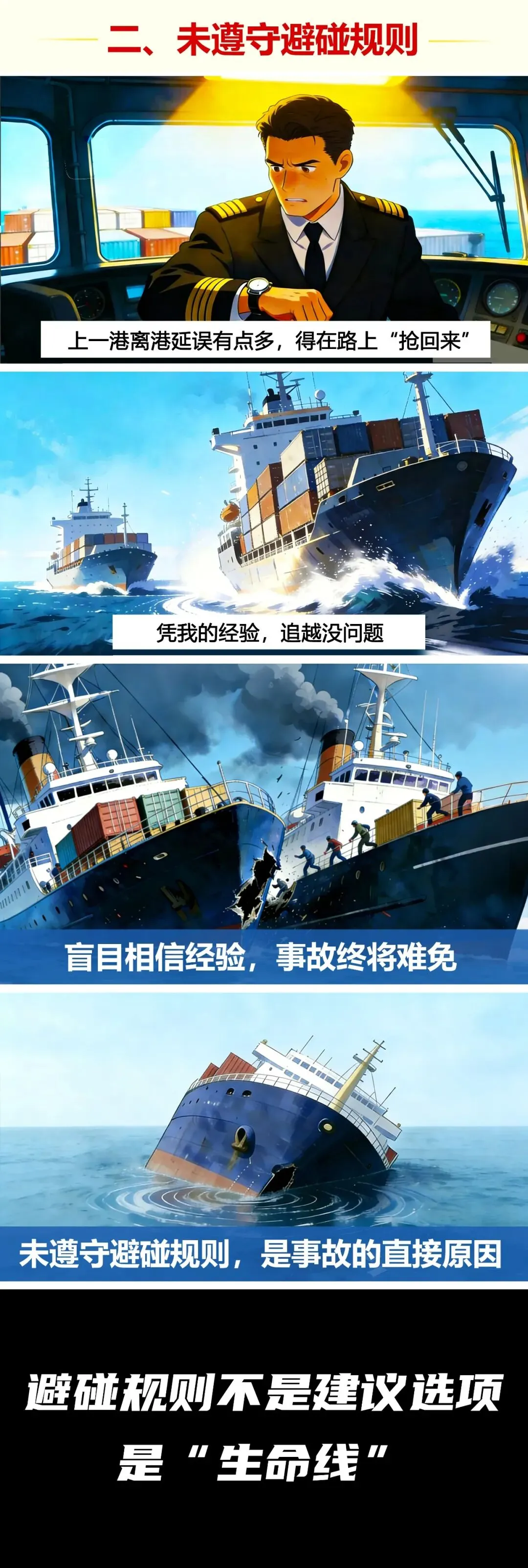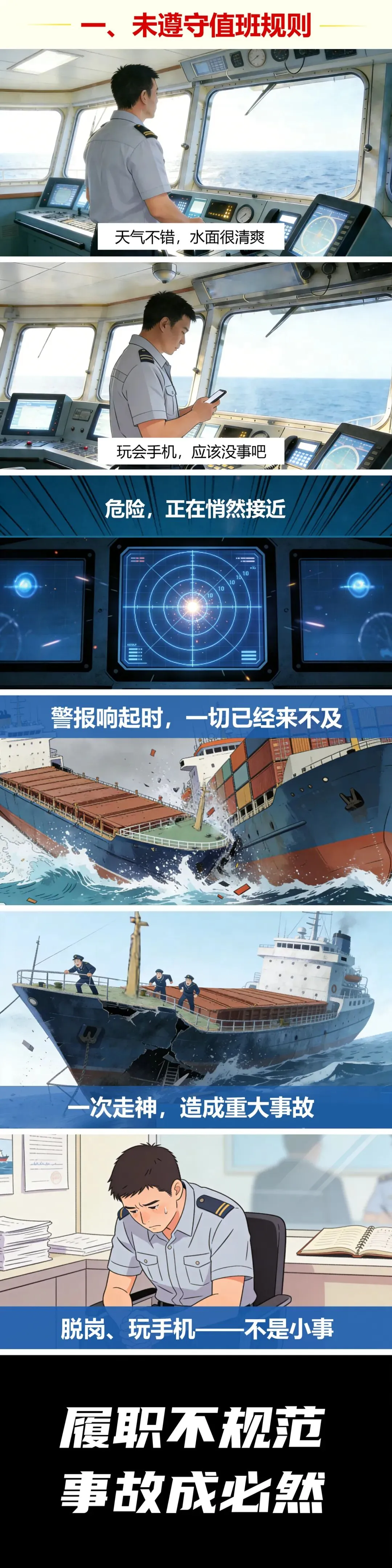 船员未遵守值班规则、未遵守避碰规则、安全管理责任落实不到位、应急处置能力不足、未重视设施设备隐患……这些都是水上事故的“导火索”,曾酿成无数惨痛后果。当前正值节后复工复产关键期,安全防线容不得丝毫松懈。小编制作了5组安全警示漫画。下面就请跟我一起学习,让安全意识常驻你我心间,让每一次远航都平安顺遂!
