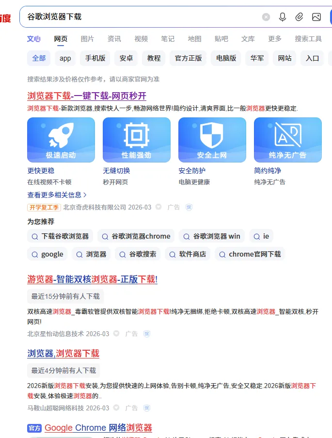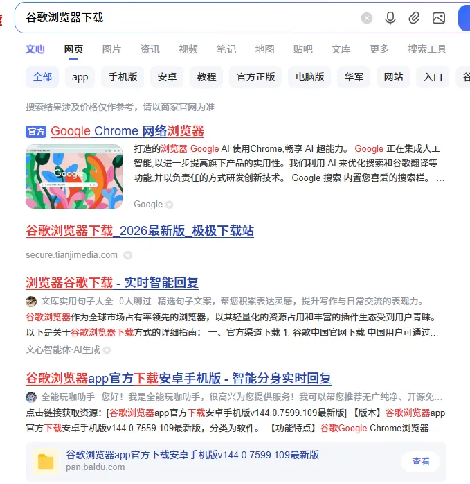 比如我想下载谷歌浏览器,在搜索引擎里搜索,谷歌浏览器下载,结果是这样的