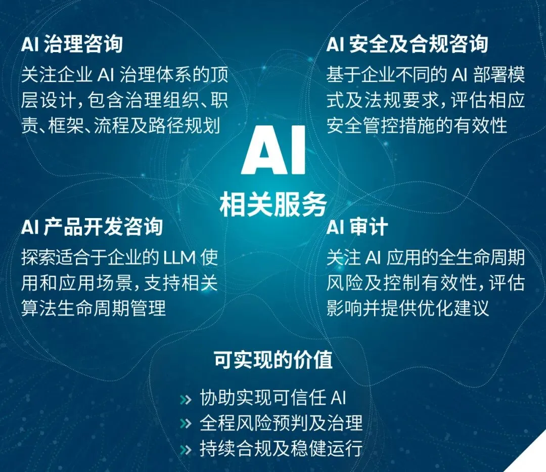 面对 AI 带来的挑战和机遇,我们可为企业提供以下四类专业服务,助您高效完成 AI 治理与合规落地。