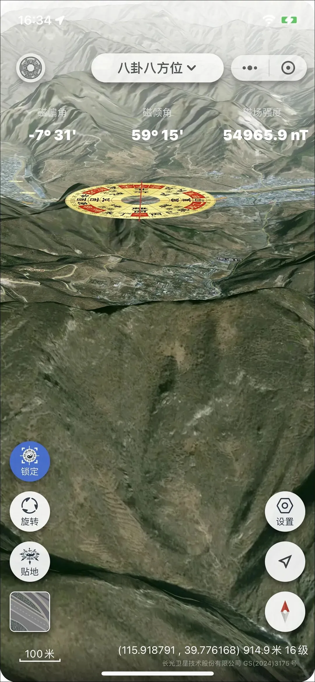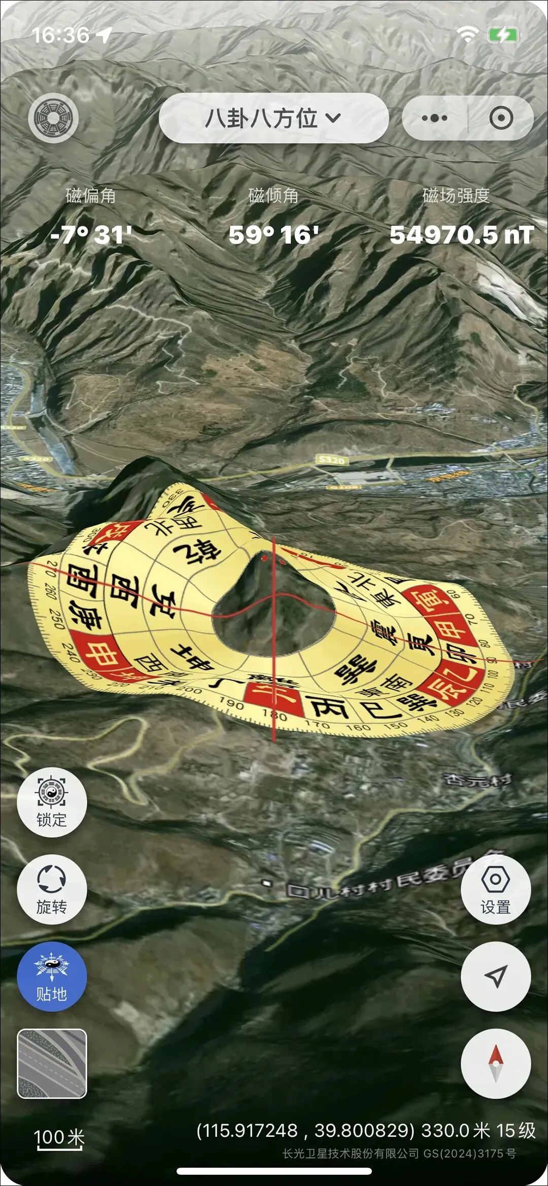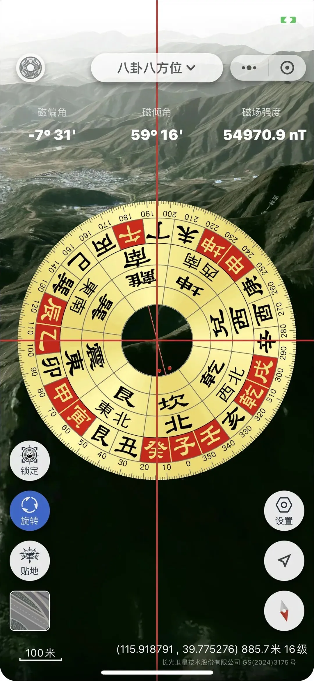 点击左下角【旋转】图标,转动手机方向,罗盘将会跟随手机转向进行自动旋转。