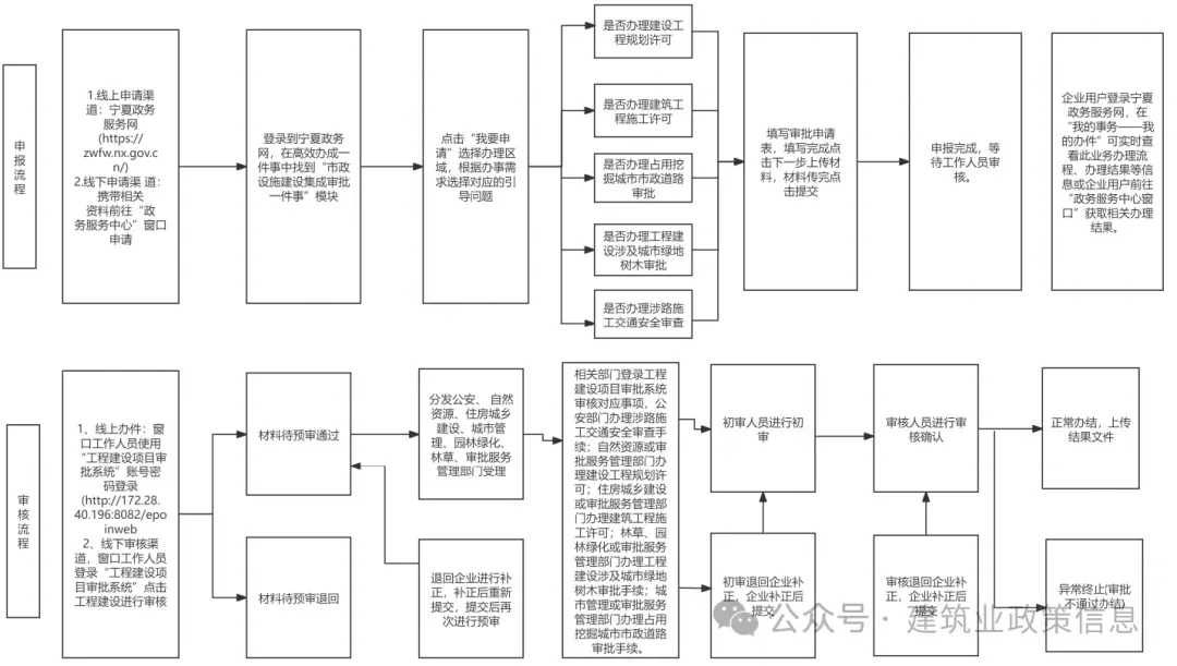 (四)协同集成审核。建设单位通过线上或线下提交材料后,由综合窗口统一收件,通过宁夏工程建设项目审批管理系统分发至公安、自然资源、住房城乡建设、城市管理、园林绿化、林草等部门办理,实现市政设施建设手续全流程“一网通办”。审核通过后,公安部门出具涉路施工交通安全审查手续;自然资源或审批服务管理部门出具建设工程规划许可证;住房城乡建设部门或审批服务管理部门出具建筑工程施工许可证;城市管理部门、住房城乡建设部门或审批服务管理部门出具占用挖掘城市市政道路审批手续;林草、园林绿化或审批服务管理部门出具工程建设涉及城市绿地树木审批意见书或建设项目占用林地、草地审核同意书。宁夏工程建设项目审批管理系统自动进行结果归集。(自治区住房城乡建设厅牵头,自治区公安厅、自然资源厅、林业和草原局按职责分工负责;完成时限:2026年4月底前)