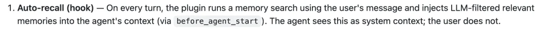 before_agent_start 在每轮对话开始前触发,用用户的消息跑一次记忆检索,把结果通过 prependContext 注入到 Agent 的上下文里。Agent 能看到这些内容,但对用户不可见。有意思的一点是,如果检索没有命中(或者 LLM 过滤后觉得结果不够用),系统不会直接跳过,而是在上下文里加一段强提示,要求 Agent 主动调用 memory_search 用更短的关键词再搜一次。