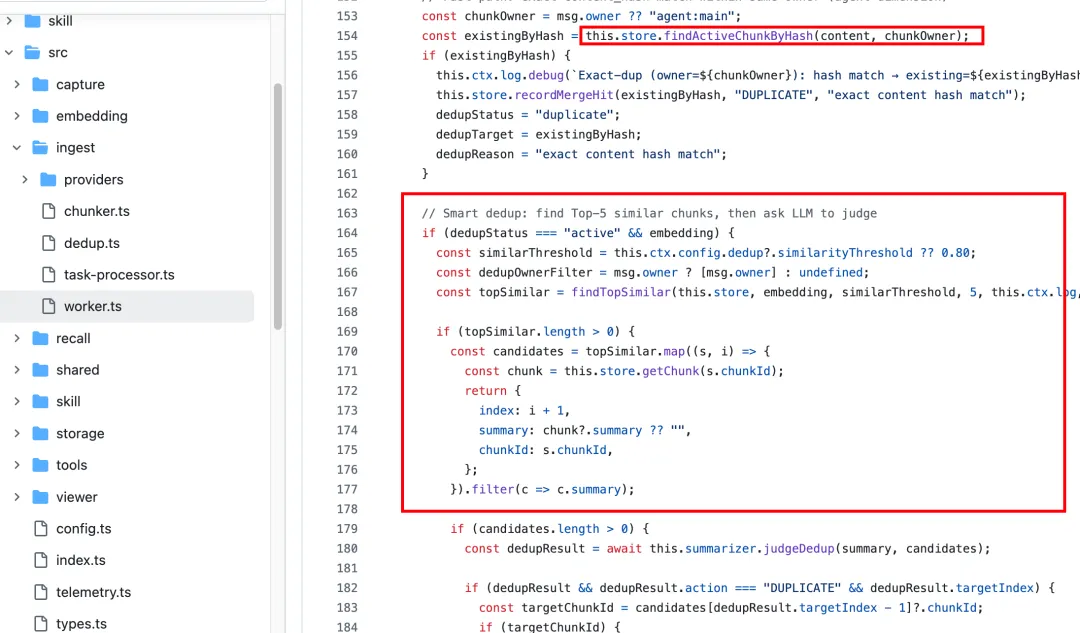 IngestWorker 是记忆写入的核心,每条消息进来都要经过摘要和去重两个步骤。