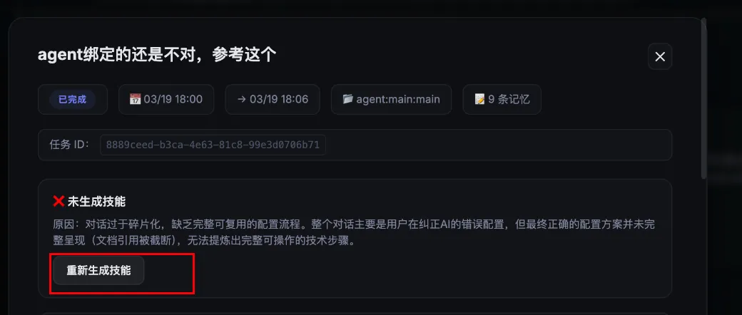 这里贴一个生成失败的截图,插件没有自动生成skill或者由于调用模型失败,也可以自己触发,但是也同样需要检测
