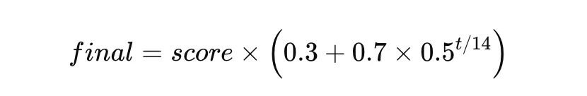 半衰期默认 14 天,也就是说 14 天前的记忆衰减到原来的一半,28 天前衰减到四分之一,以此类推。