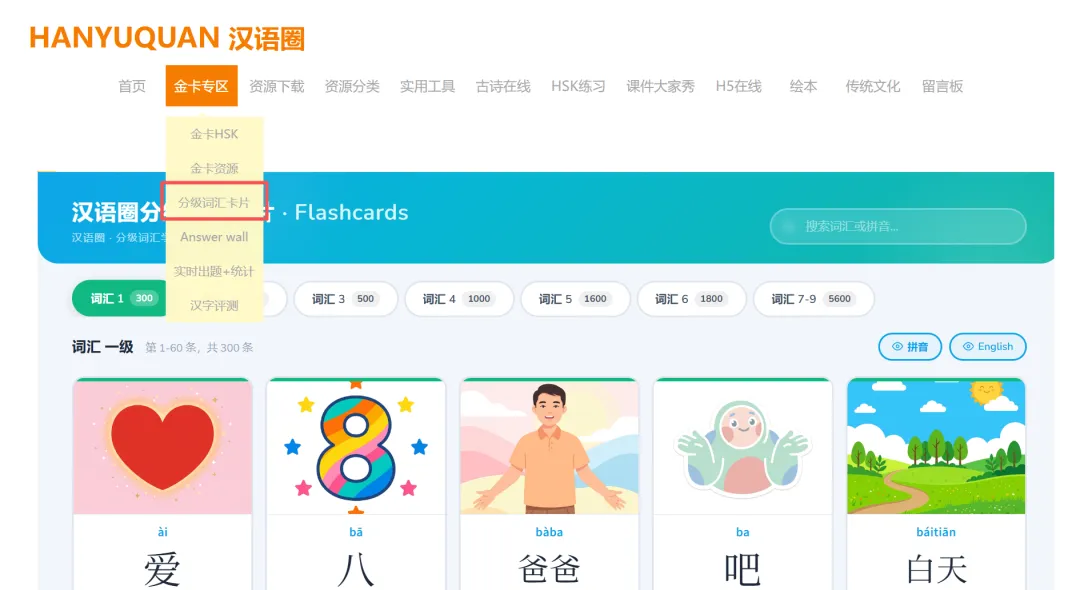 👉 进入汉语圈资源网站www.zzchinese.com,金卡用户即可使用分级词汇卡片,让您的汉语课堂更加精彩!