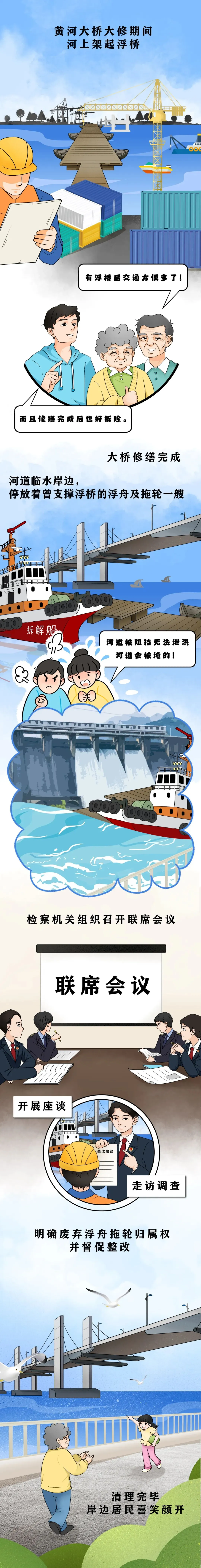河南省检察院、河南省检察院郑州铁路运输分院多次与相关行政机关磋商,厘清行政监管职责。2022年4月,河南省检察院郑州铁路运输分院向濮阳县政府发出诉前检察建议,督促其在汛期前将浮舟撤离河道。最终,所有浮舟切割后共计3300吨钢铁全部清运完毕,河道恢复原貌。