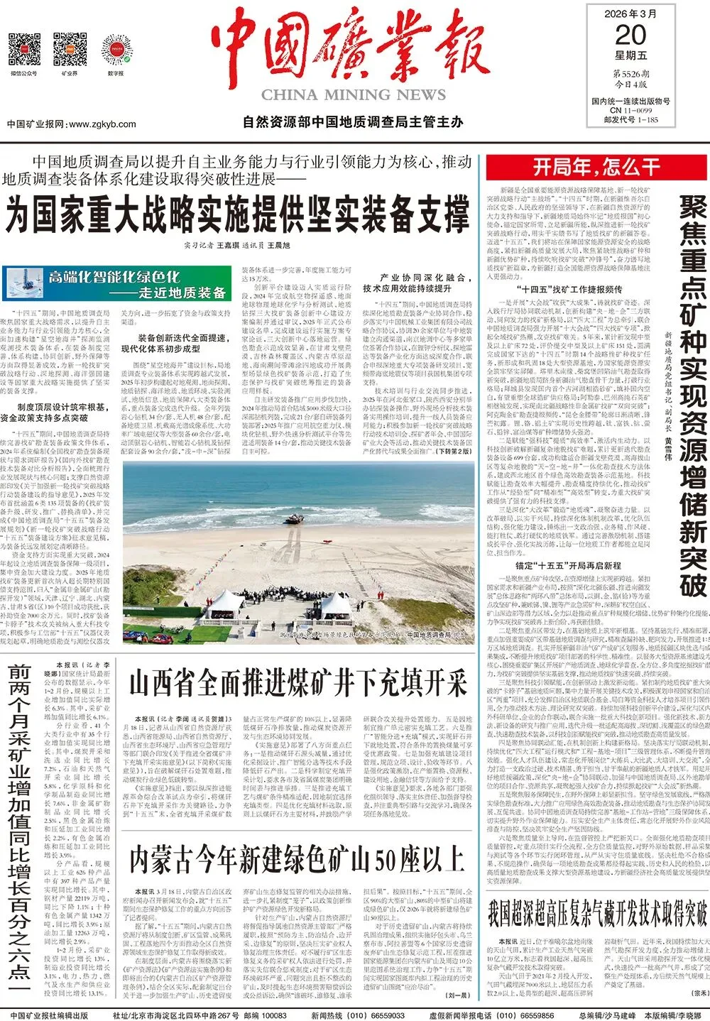 “十五五”时期,我国将完善战略性矿产资源的探、产、供、储、销统筹和衔接体系,强化战略性矿产资源的安全风险监测预警,优化战略性矿产资源目录,制定提高勘探、开发、储备能力的方案,持续推进战略性矿产资源增储上产。2026年作为开局年,我国将继续开展新一轮找矿突破战略行动,加强基础地质调查,健全找矿突破支持政策,促进战略性矿产增储上产。为凝聚行业奋进力量,本报1月19日起推出“开局年,怎么干”专栏,邀请各省级自然资源主管部门和地勘单位主要负责同志,围绕保障国家能源资源安全、推动重要矿产增储上产谈认识、谈思路、谈举措。
